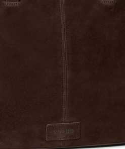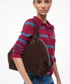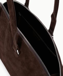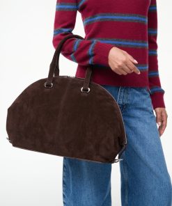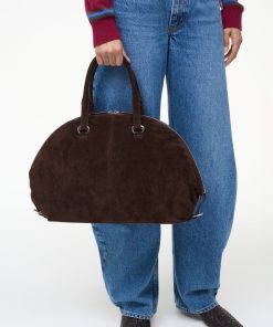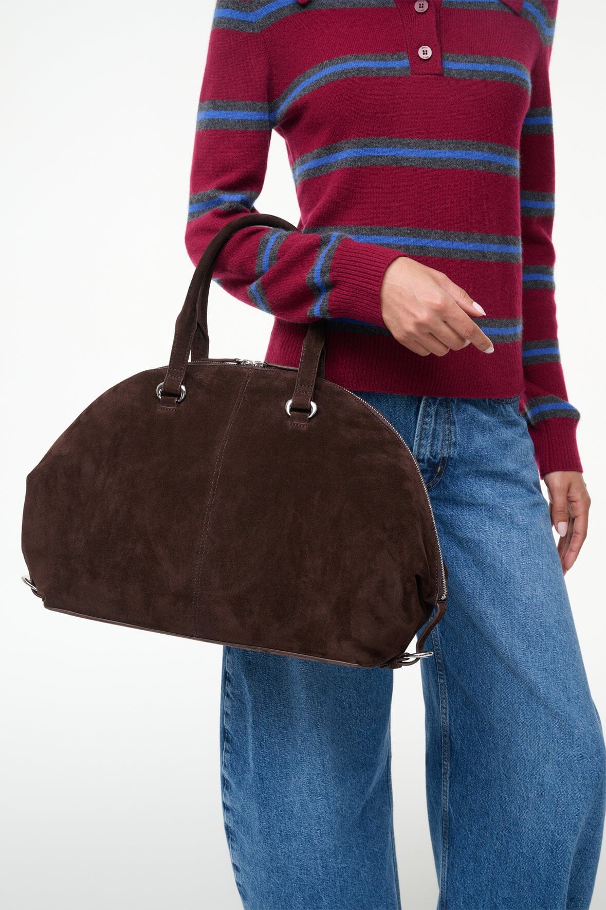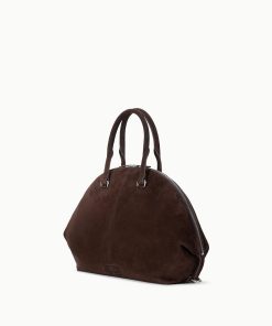 The Hester Satchel is a new large dome-shaped satchel, with a double zipper and double handles that you can fit over your shoulder. This style is crafted in a supple espresso suede.