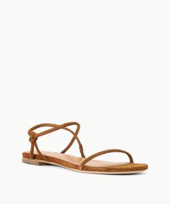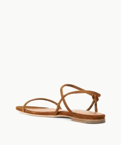 A flat suede sandal with tubular straps, the Laurel Sandal features a leather cord toe and ankle strap.