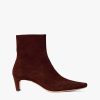 A leather ankle boot, this style features a pointed rectangular toe and a blade heel. The Wally Ankle boot features a side zip closure and has been updated in espresso woven leather for Fall.