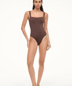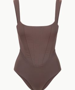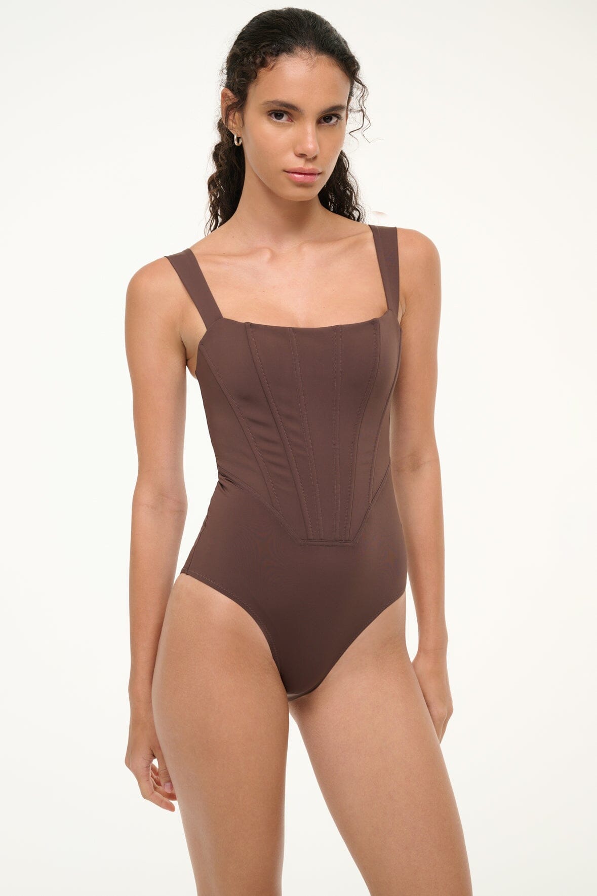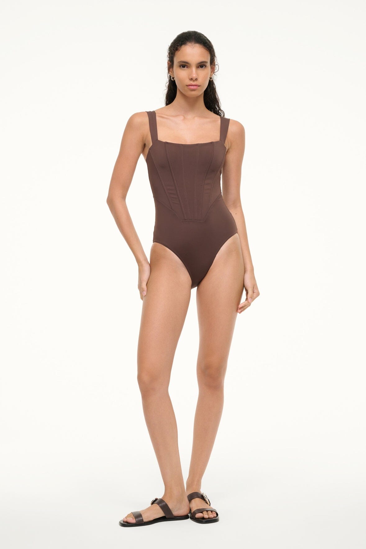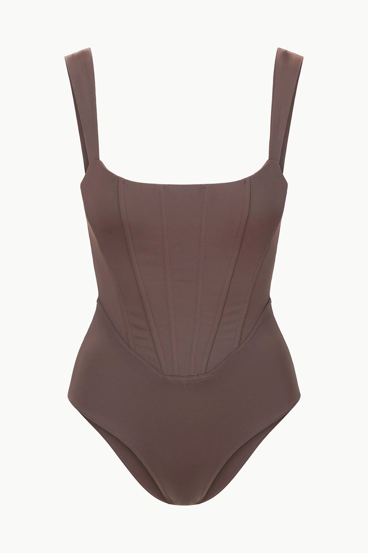 The Adelaide is a new one piece swimsuit with corset-style boning throughout the chest and torso. This style features zipper at the back and supportive shoulder straps.