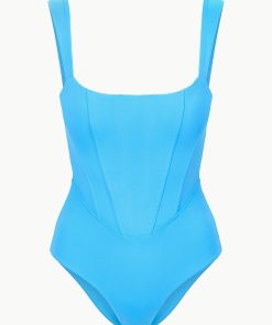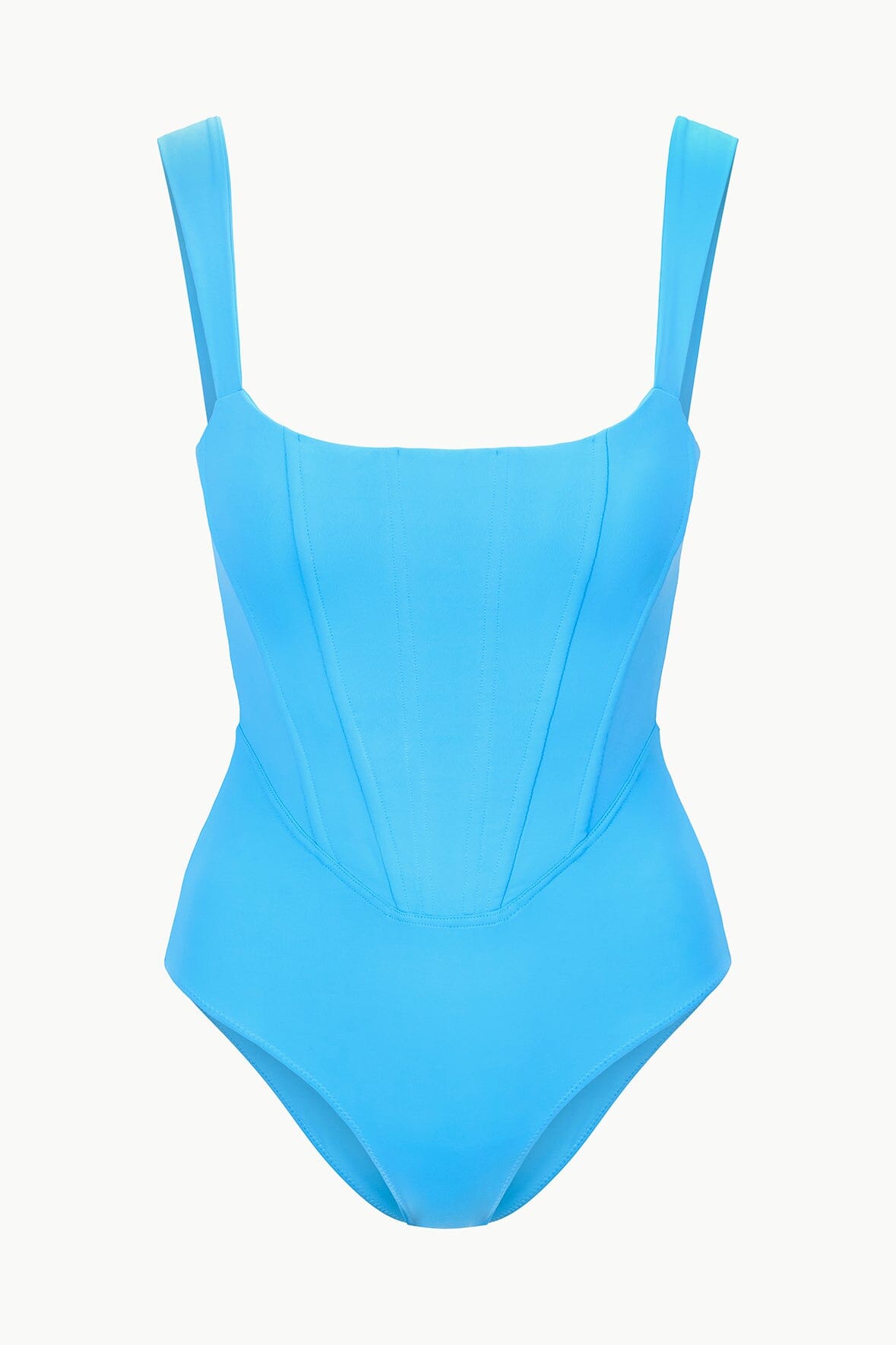 The Adelaide is a new one piece swimsuit with corset-style boning throughout the chest and torso. This style features zipper at the back and supportive shoulder straps.