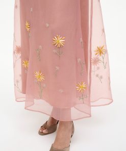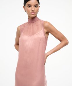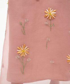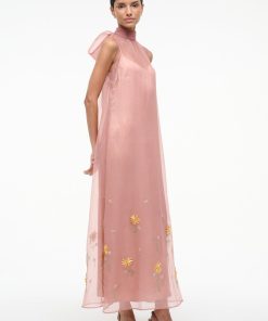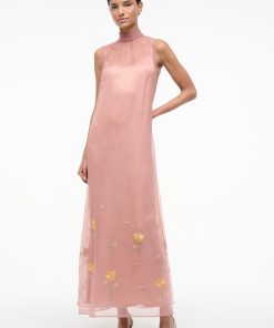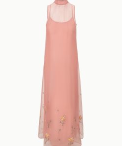 The Albee Dress is an organza sleeveless dress featuring hand beaded embellishment throughout the skirt and a high neck with a functional tie in the back. This style is sheer organza and has a separate interior slip.