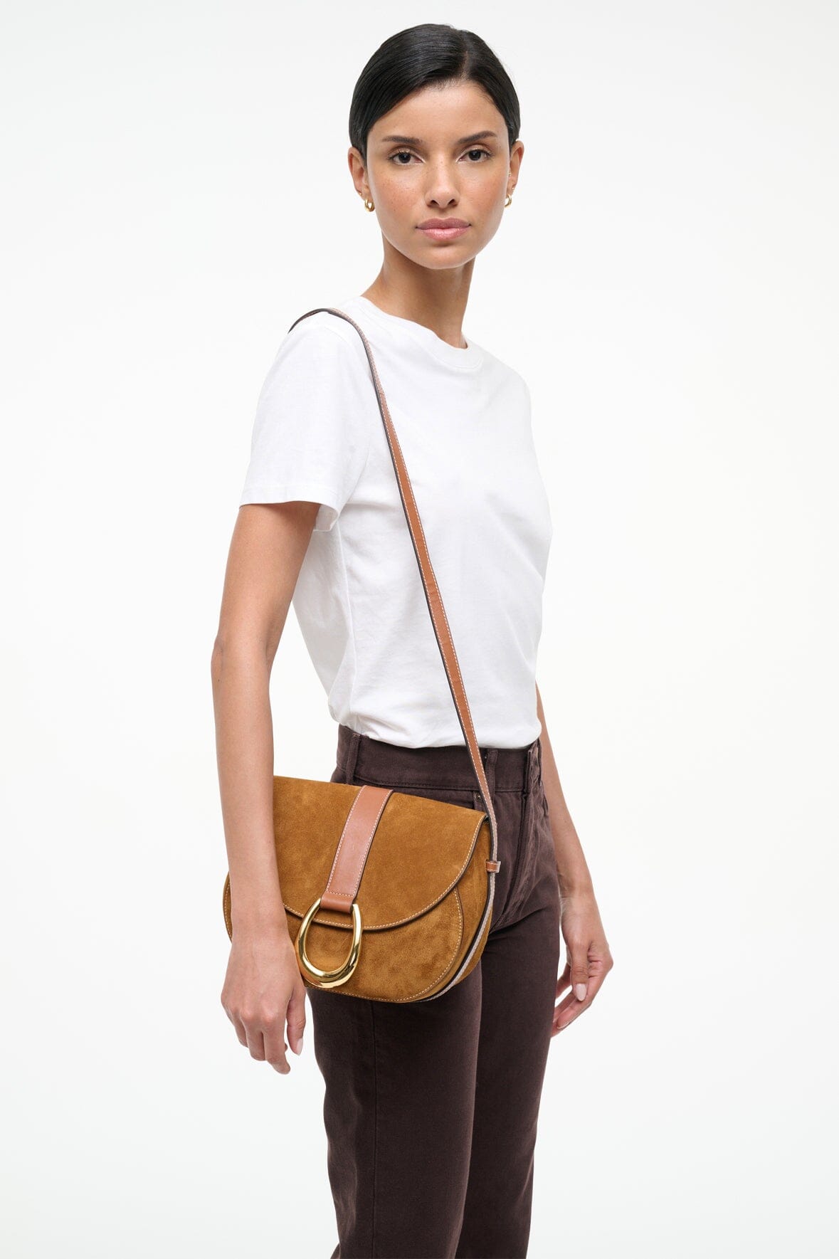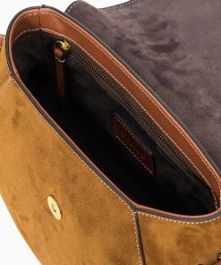 The Bella Saddle Bag is a suede flap closure bag featuring our signature hardware and an adjustable long strap. The Bella has an interior zip pocket and can be worn as a crossbody or on the shoulder.