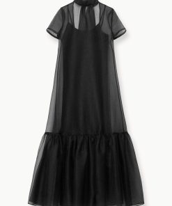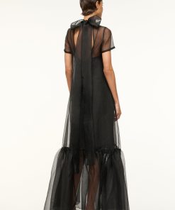 The Calluna Dress is a high neck organza gown with scoop back and functional neck tie. This style features a tiered ruffle hem and a midi slip.