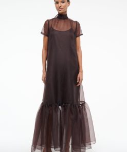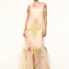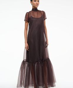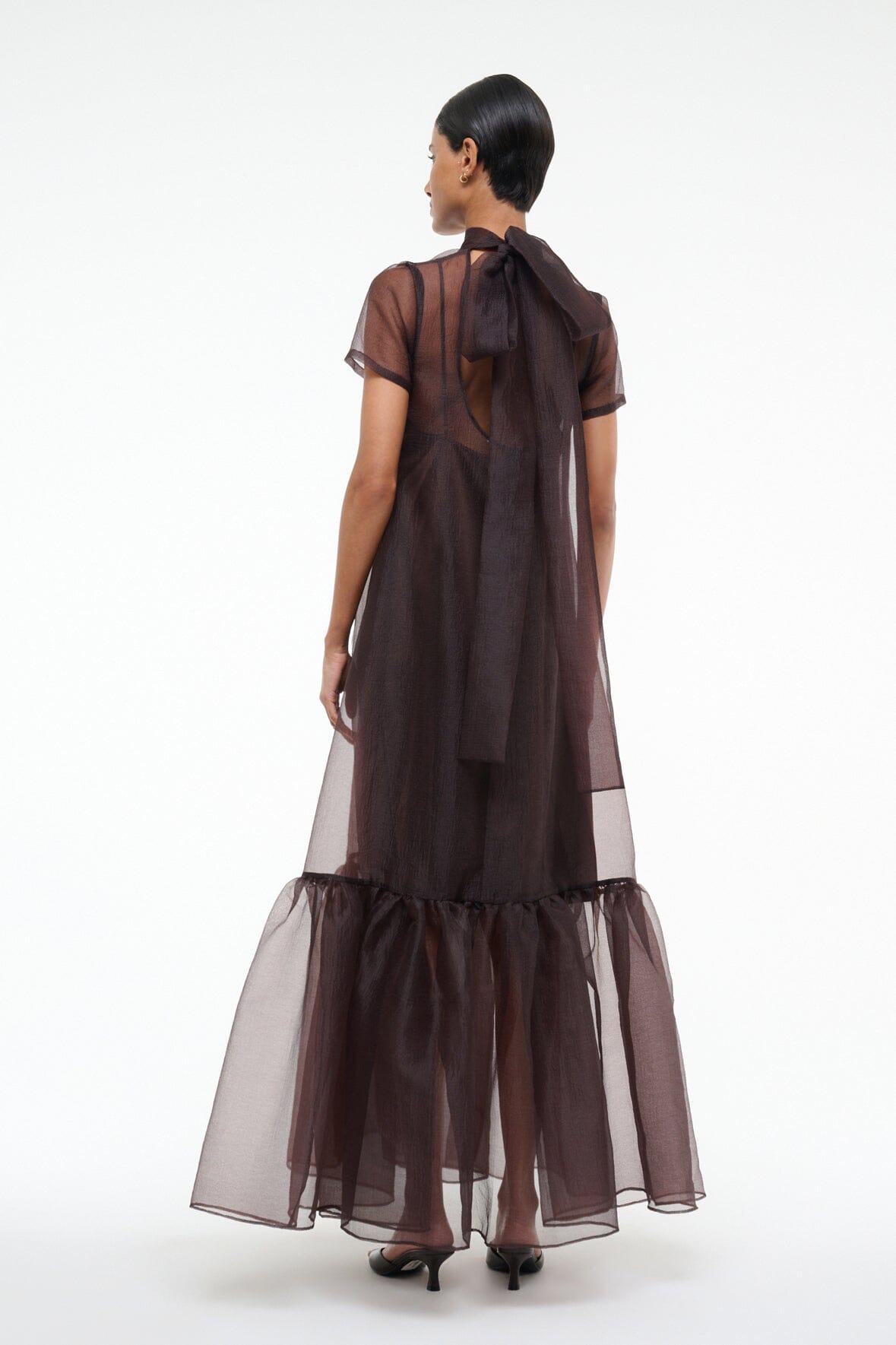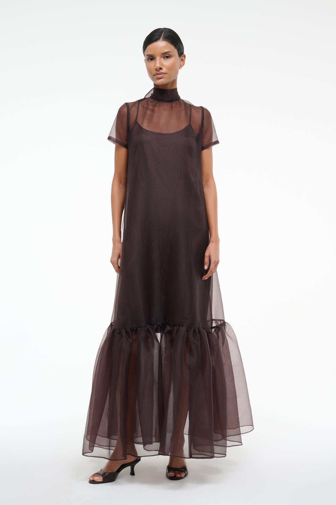 The Calluna Dress is a high neck organza gown with scoop back and functional neck tie. This style features a tiered skirt ruffle hem.