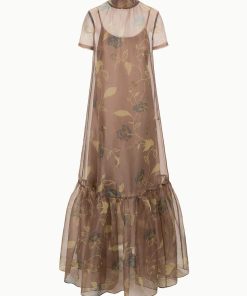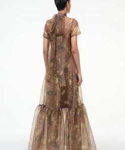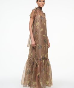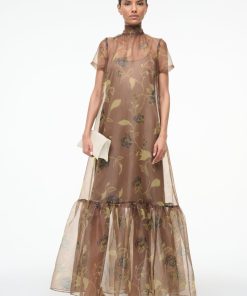 The Calluna Dress is a high neck organza gown with scoop back and functional neck tie. This style features a tiered skirt ruffle hem. Updated in a stretchy removable slip for added comfort and ease of use.