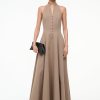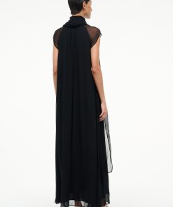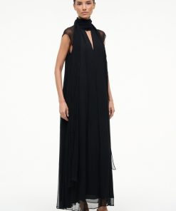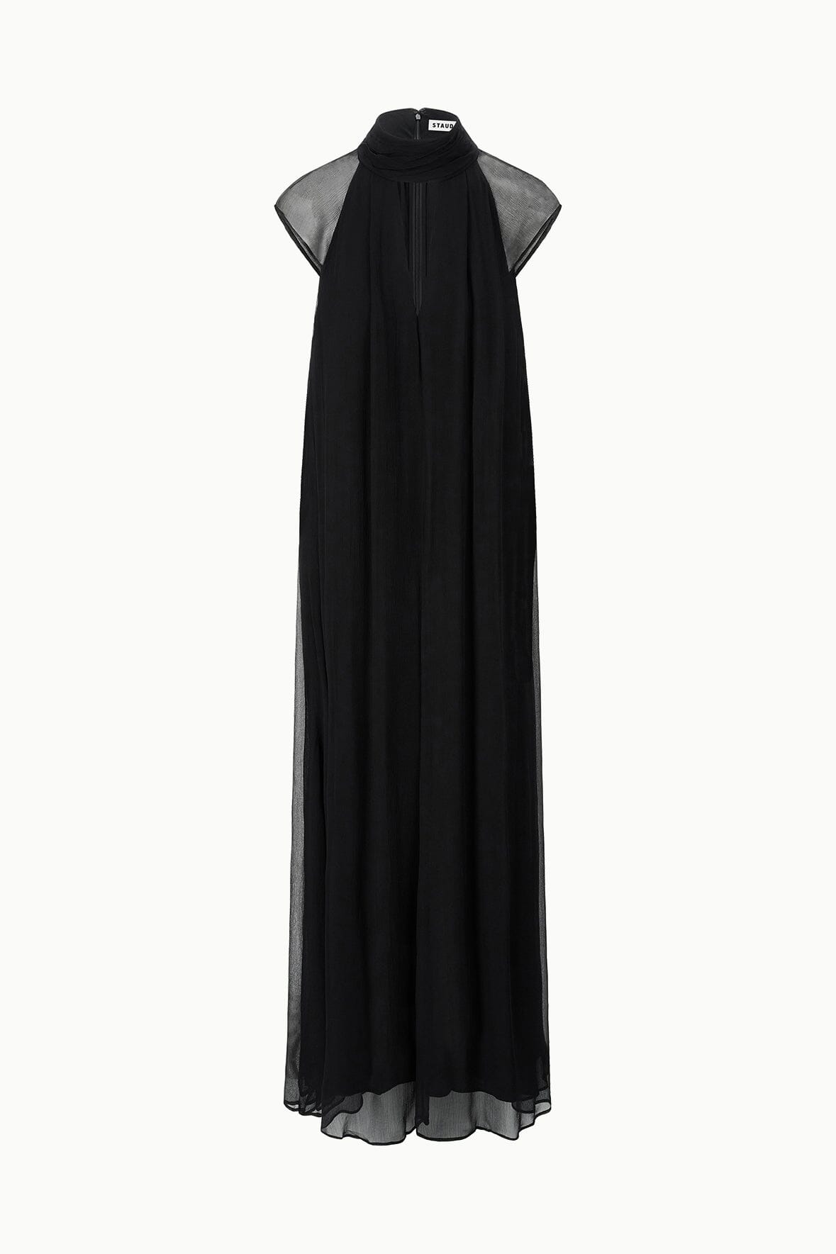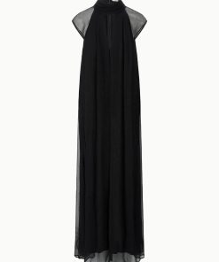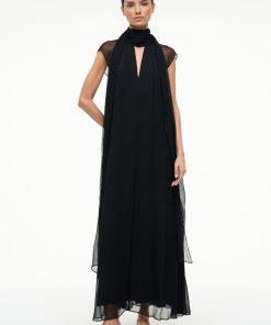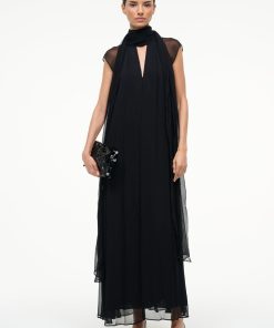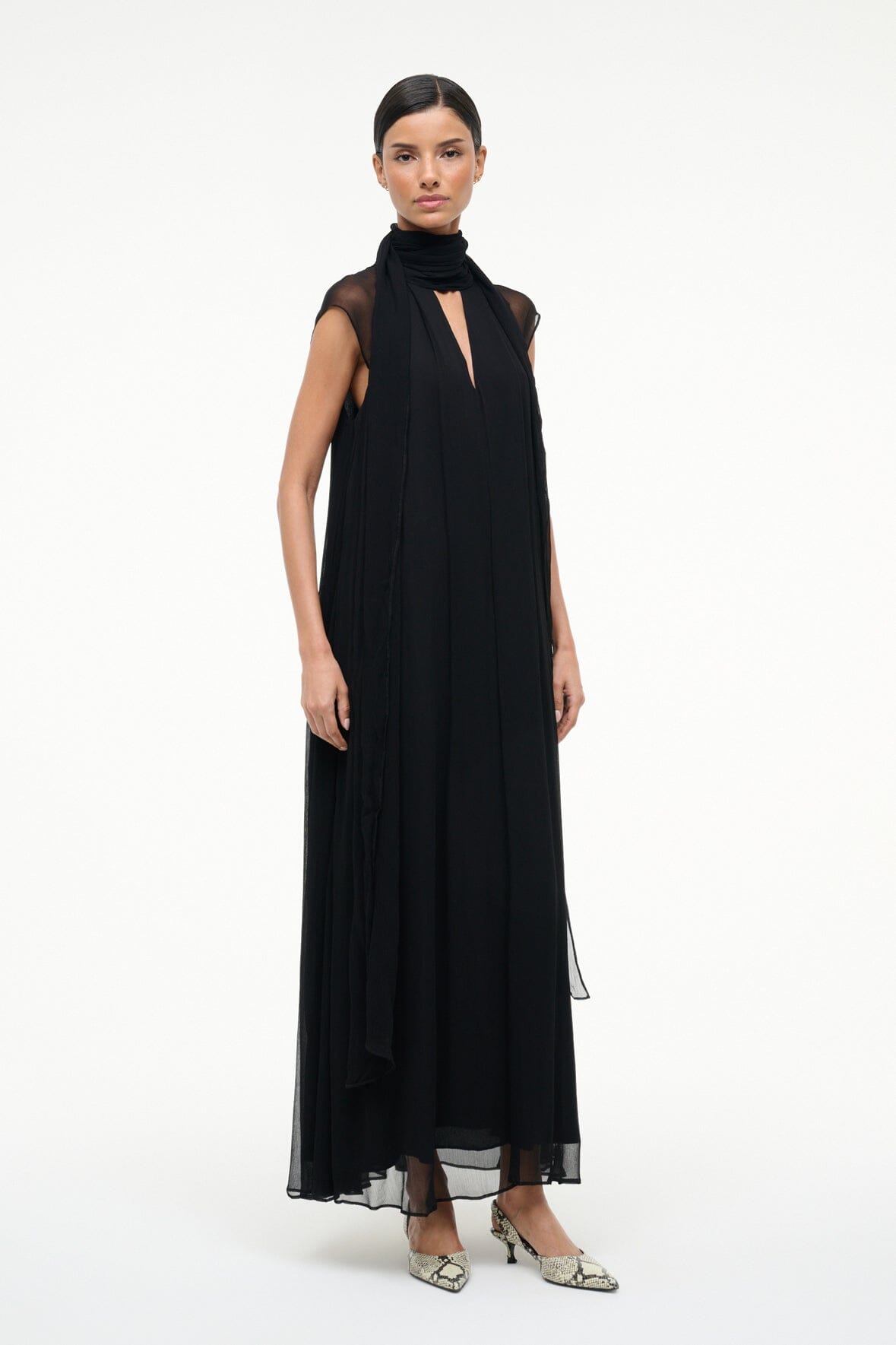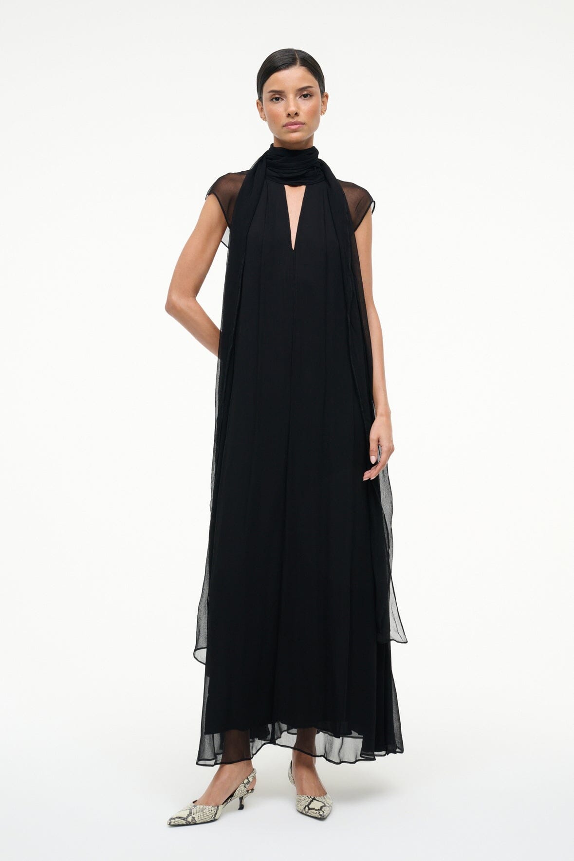 The Camilla Maxi Dress is a flowy tent dress in crinkle chiffon, featuring sheer cap sleeves and a scarf neck tie detail.