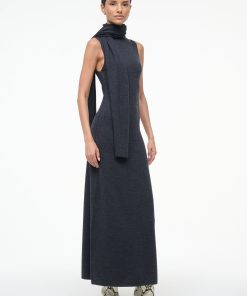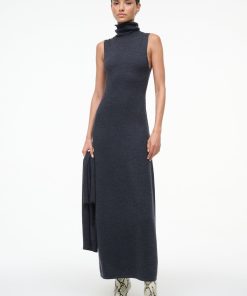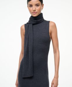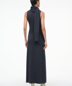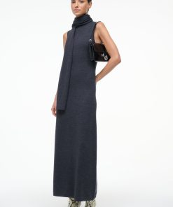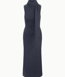 The Canal Midi Dress is a midi-length fitted sweater dress featuring a detachable scarf. This style features a roll neck turtleneck and a back seaming detail.