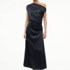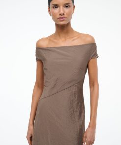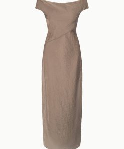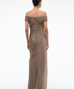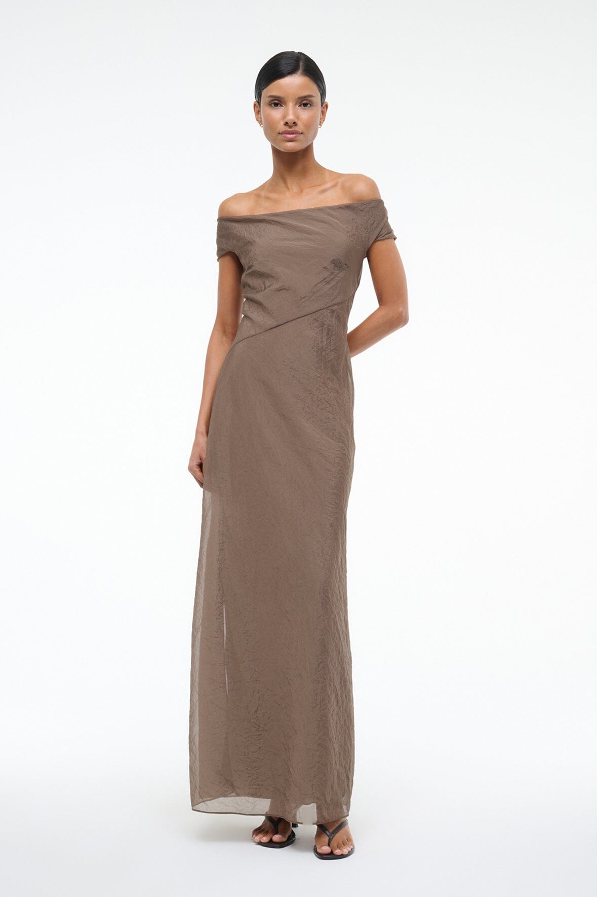 This is an off-the-shoulder maxi length dress crafted from a sheer organza. The Cheyenne is cut on the bias for a flattering fit.