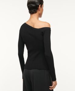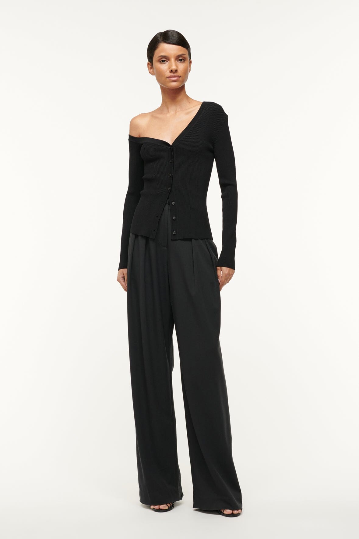The Craftsman Sweater is our chic update to a classic fitted cardigan. This style is an off-one-shoulder button up cardigan.