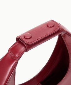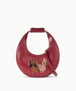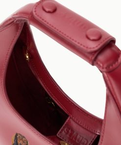 The Mini Moon Bag features a zipper closure, antique gold hardware, and suede lining.