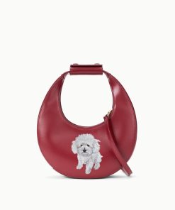 The Mini Moon Bag features a zipper closure, antique gold hardware, and suede lining.