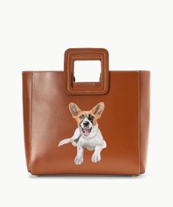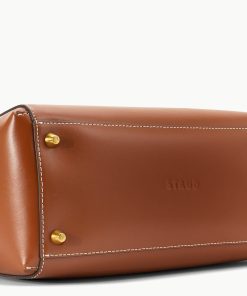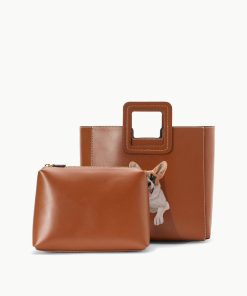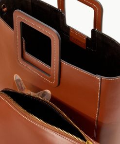 The Shirley Leather Bag features a zipper closure, antique gold hardware, and suede lining.