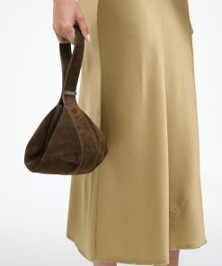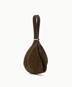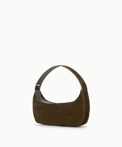 The Demy Shoulder Bag is a chic convertible bag that can be worn over the shoulder or hand held. It features signature hardware clasp on the strap to convert the shape to a handheld pouch. This style features a suede body, a top zipper, and signature hardware.