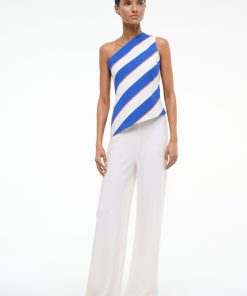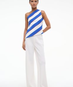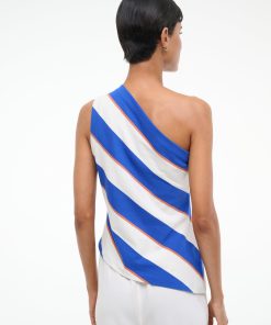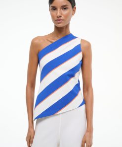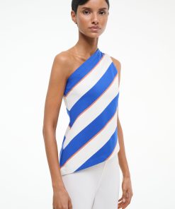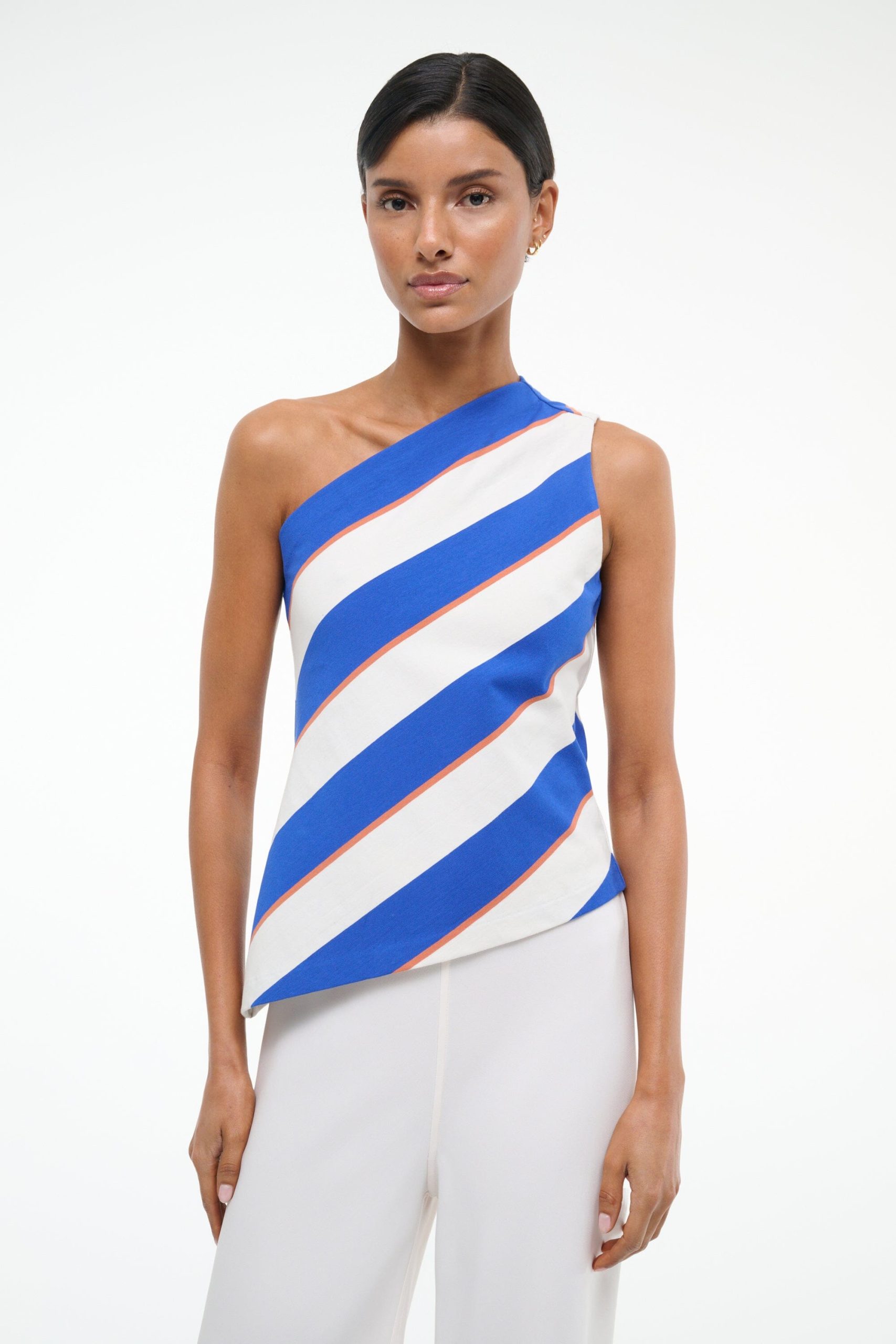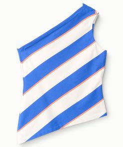The Esme Top is a one shoulder sleeveless jersey top, featuring an asymmetrical hem, in our seasonal rugby stripe.
