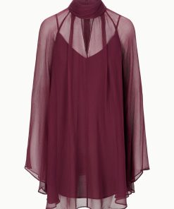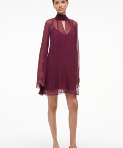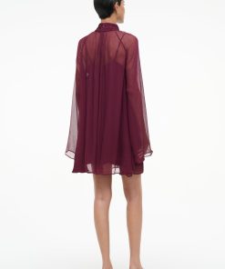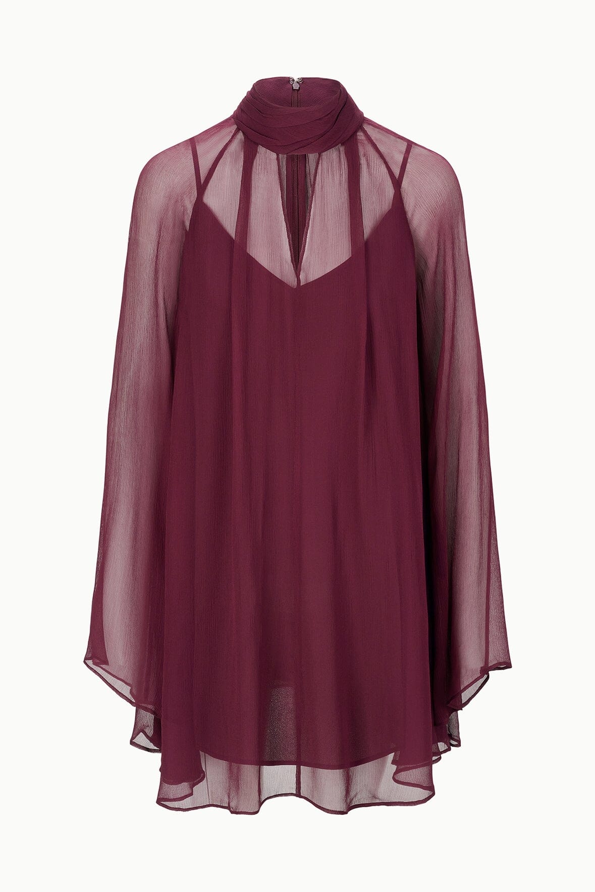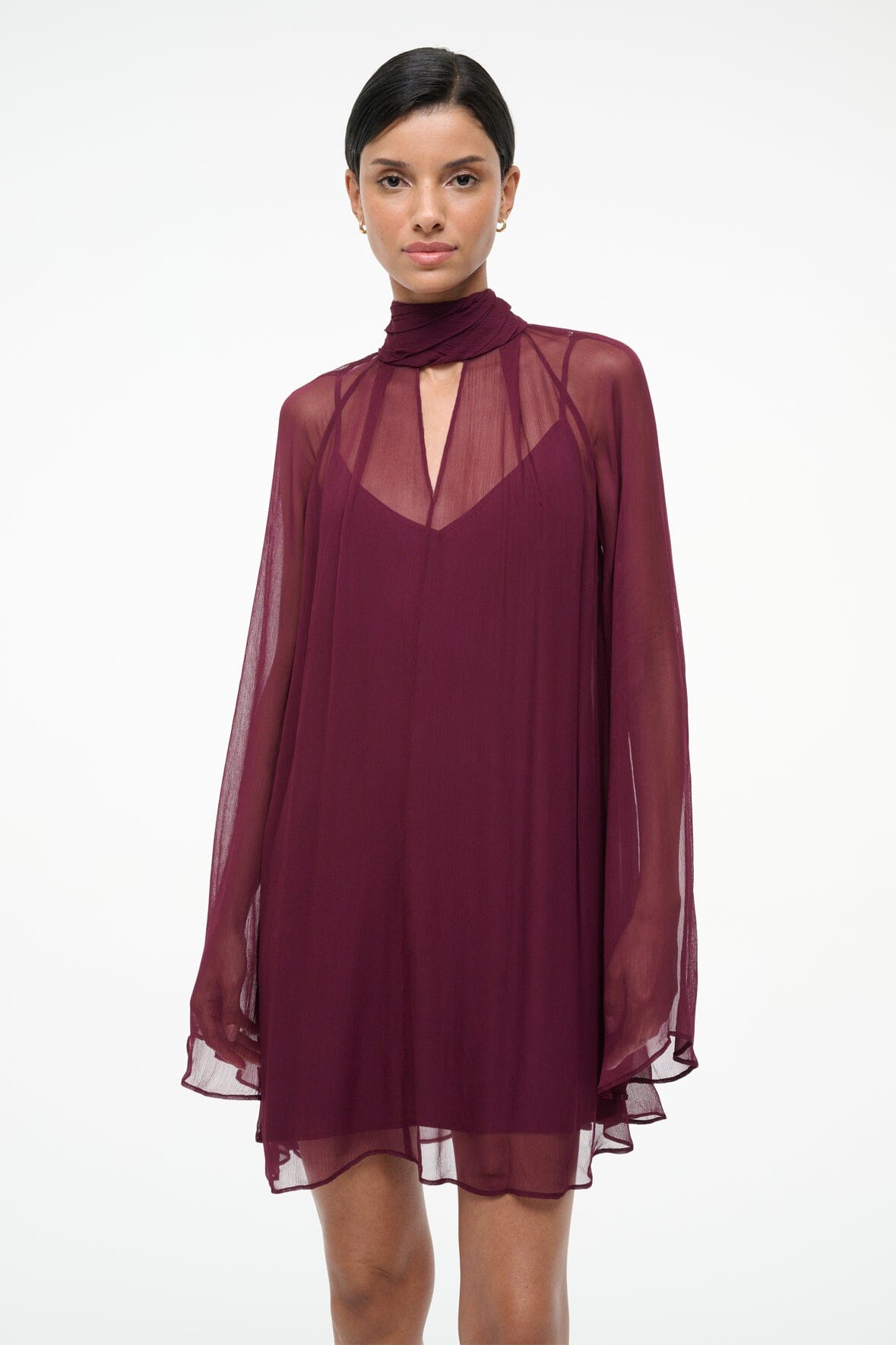 The Esther Mini Dress is a long sleeve flowy mini dress featuring a sheer chiffon overlay, a keyhole cutout, and a scarf neck tie feature.