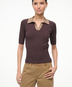 The Gene Top is a compact yarn fitted polo top with a mid length sleeve and contrast collar.