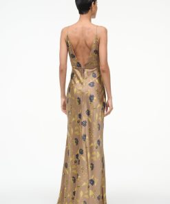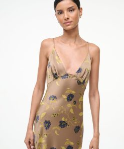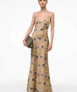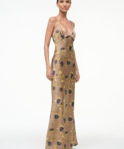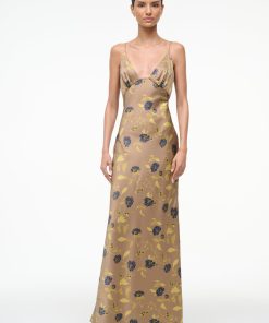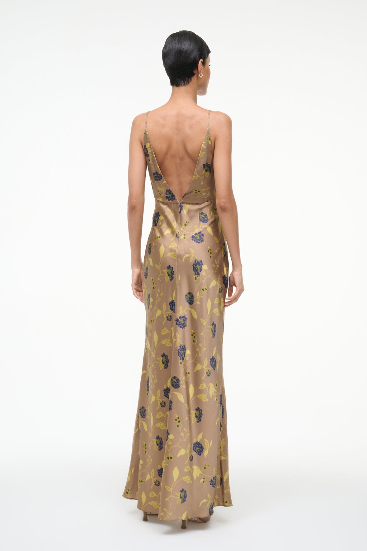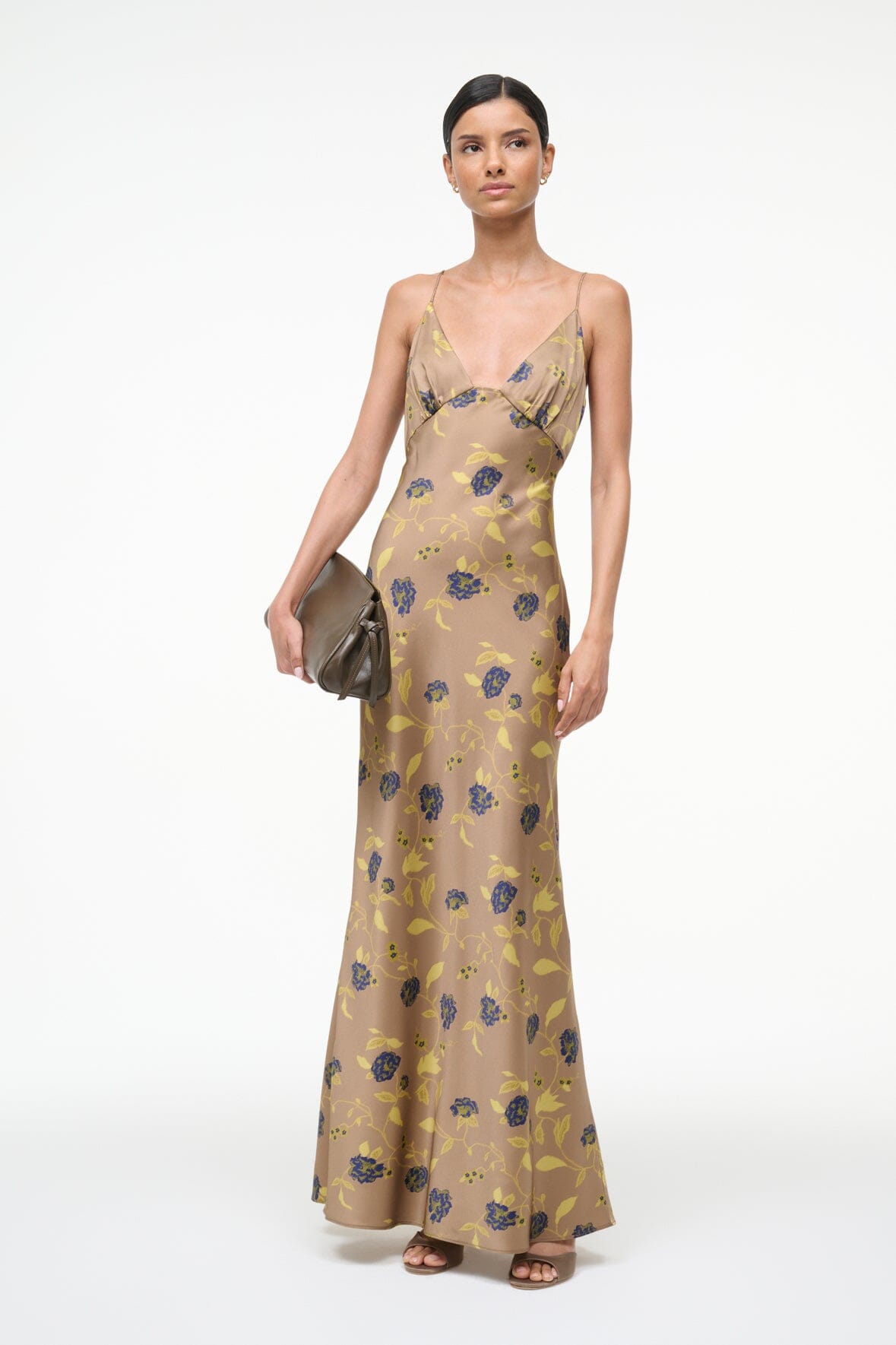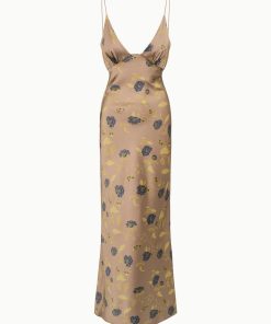 A maxi dress crafted in silk satin, the Hank features classic slip dress details in a v-neckline and spaghetti straps.