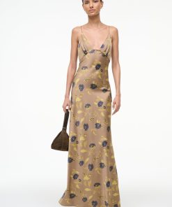 A maxi dress crafted in silk satin, the Hank features classic slip dress details in a v-neckline and spaghetti straps.