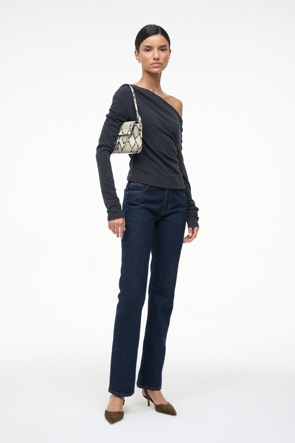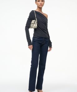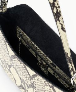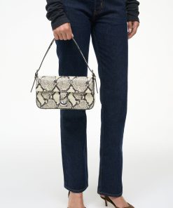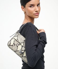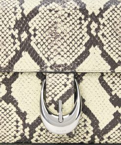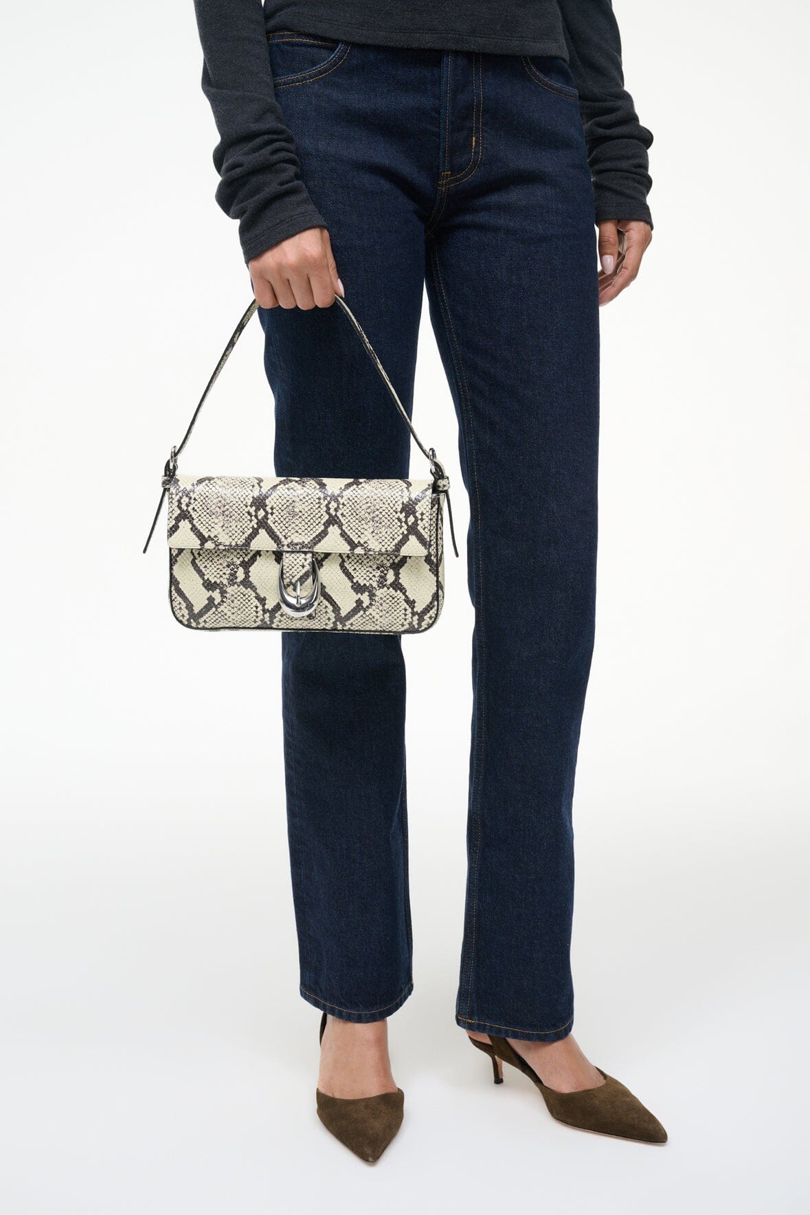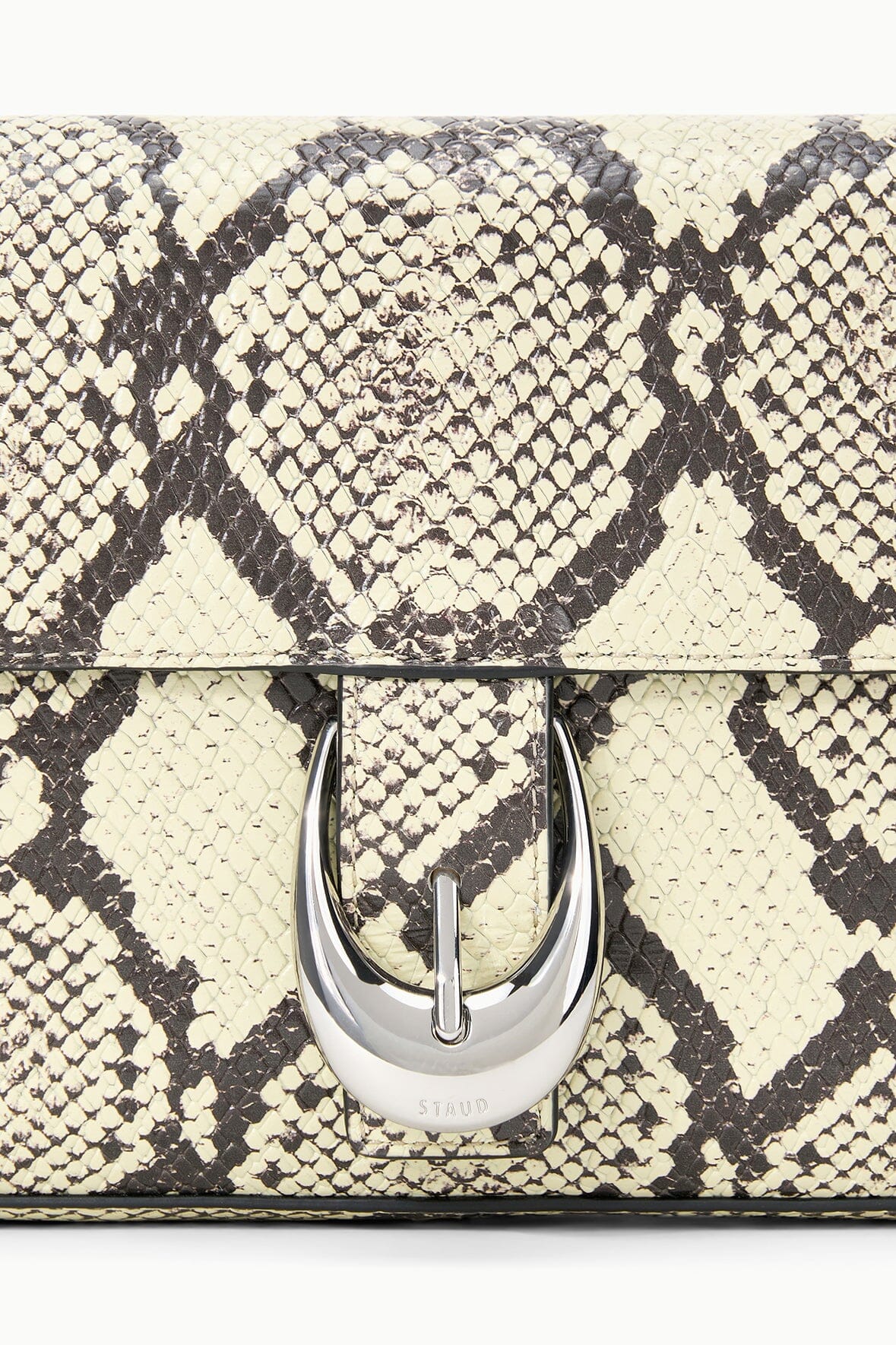 The Harlow Bag features a center front Moon buckle, and has a snap closure and interior pocket.