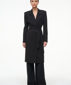 The Jolene is knee-length wrap jacket. This style features structured shoulders, a lapel, and a belt for an updated tailored look.