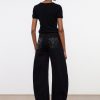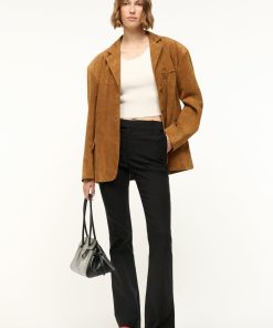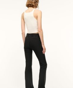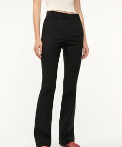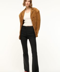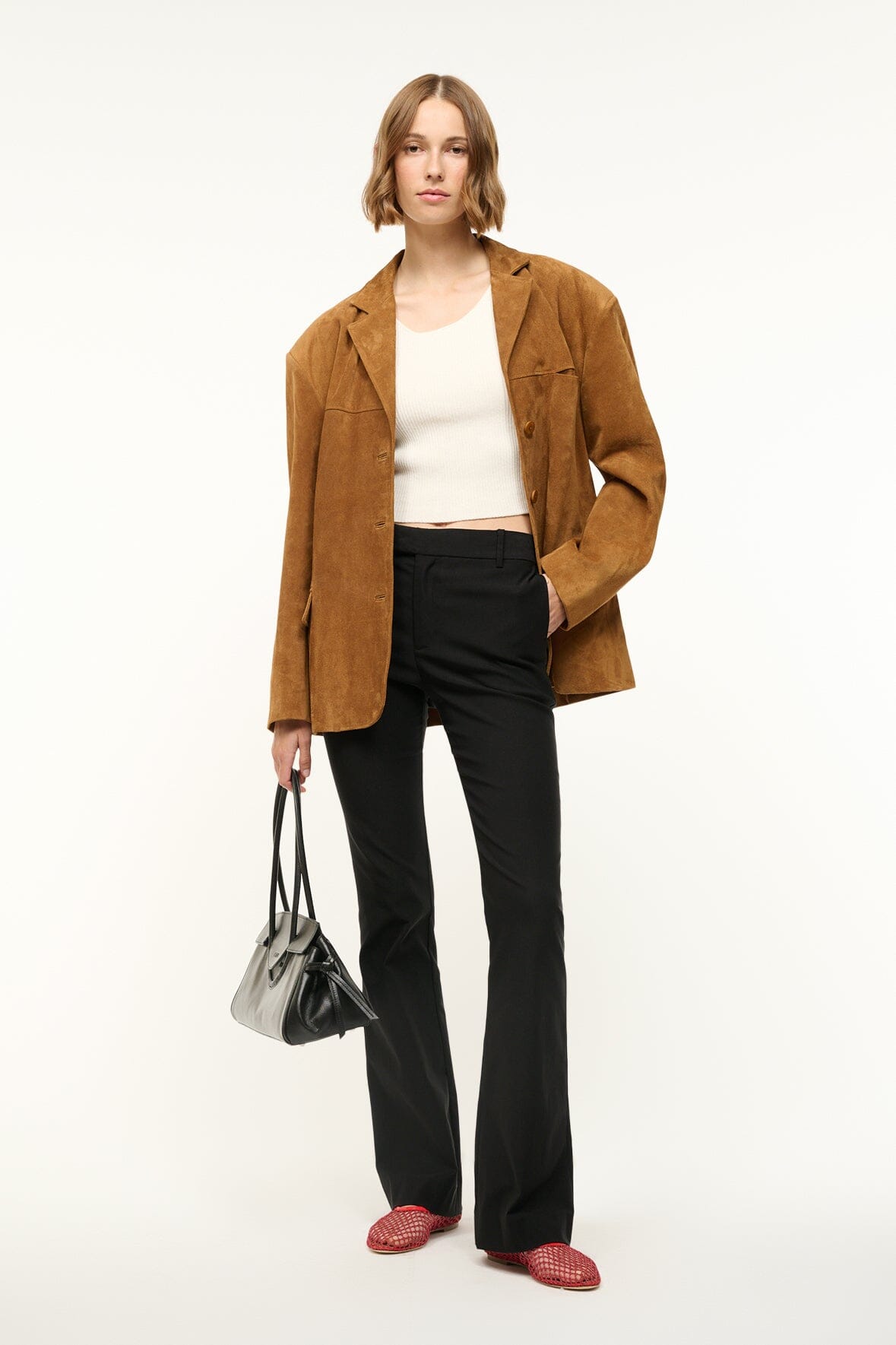 The Kat Pant in stretch suiting fabric is a mid-rise flare pant with a zipper fly and belt loops.