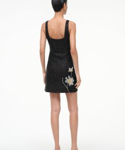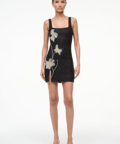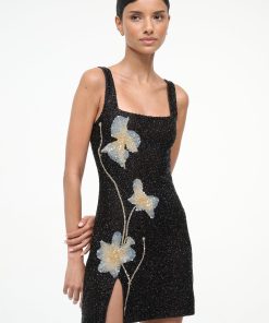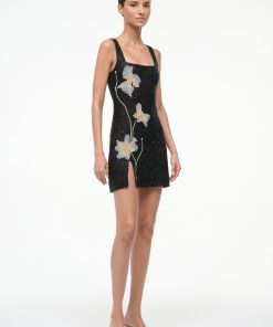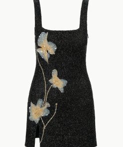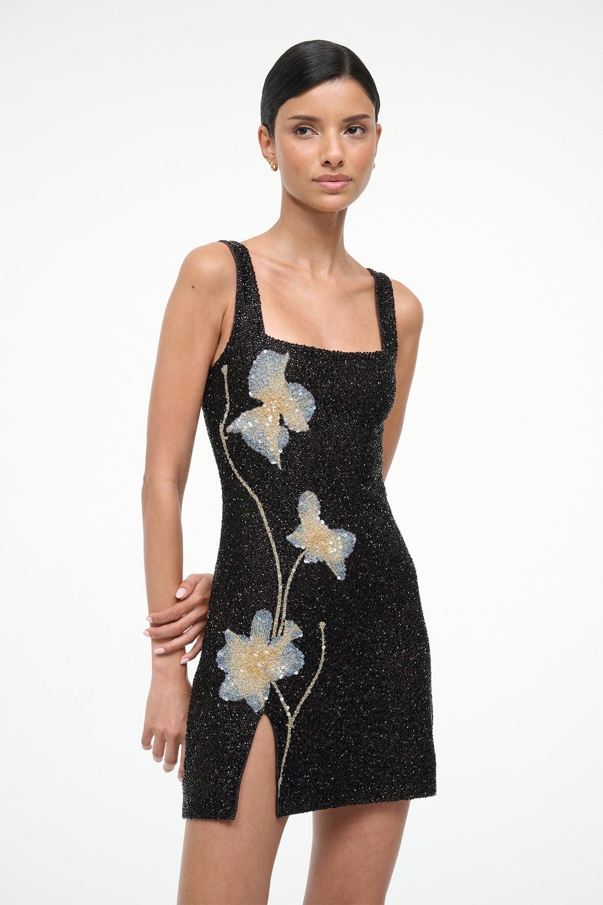 Our best-selling beaded mini dress has been updated for Fall featuring a hand beaded floral motif. The Le Sable Dress has a side slit and a hidden zipper at the back.