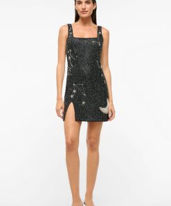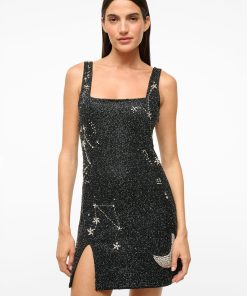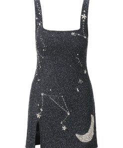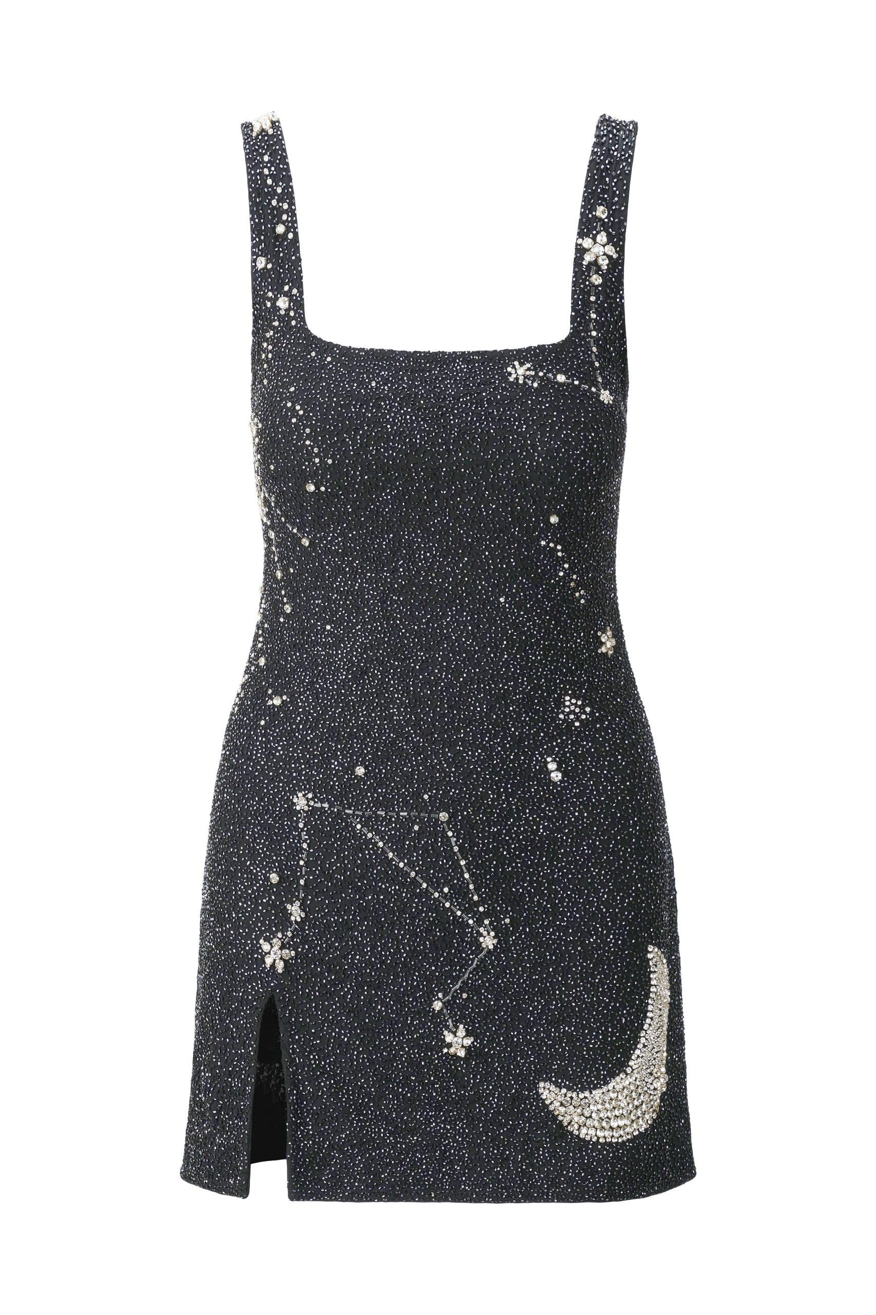 Our best-selling hand beaded mini dress has been updated in a constellation-inspired pattern for the Holiday season. This style is fully beaded and features a slit and a hidden side zipper.