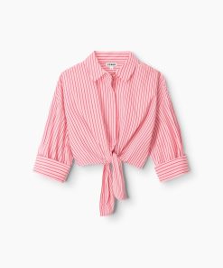 The Lisa Top is a cropped button down shirt with a center front tie and elasticated waistband. This styles features fixed 3/4 length sleeves for ease.
