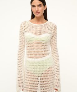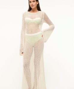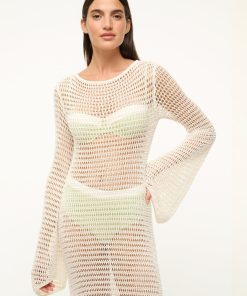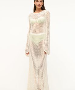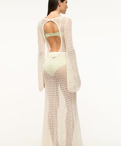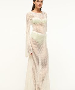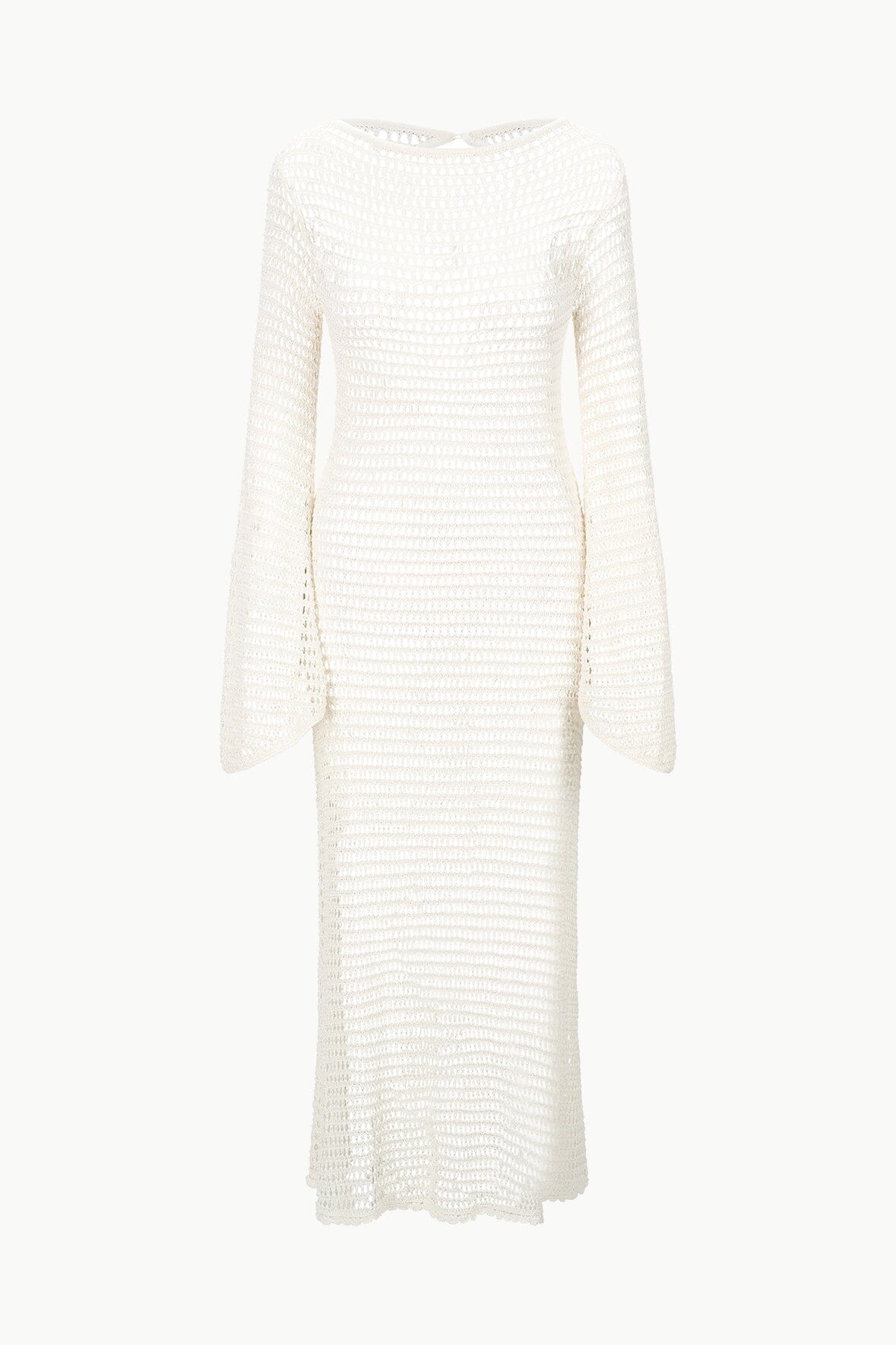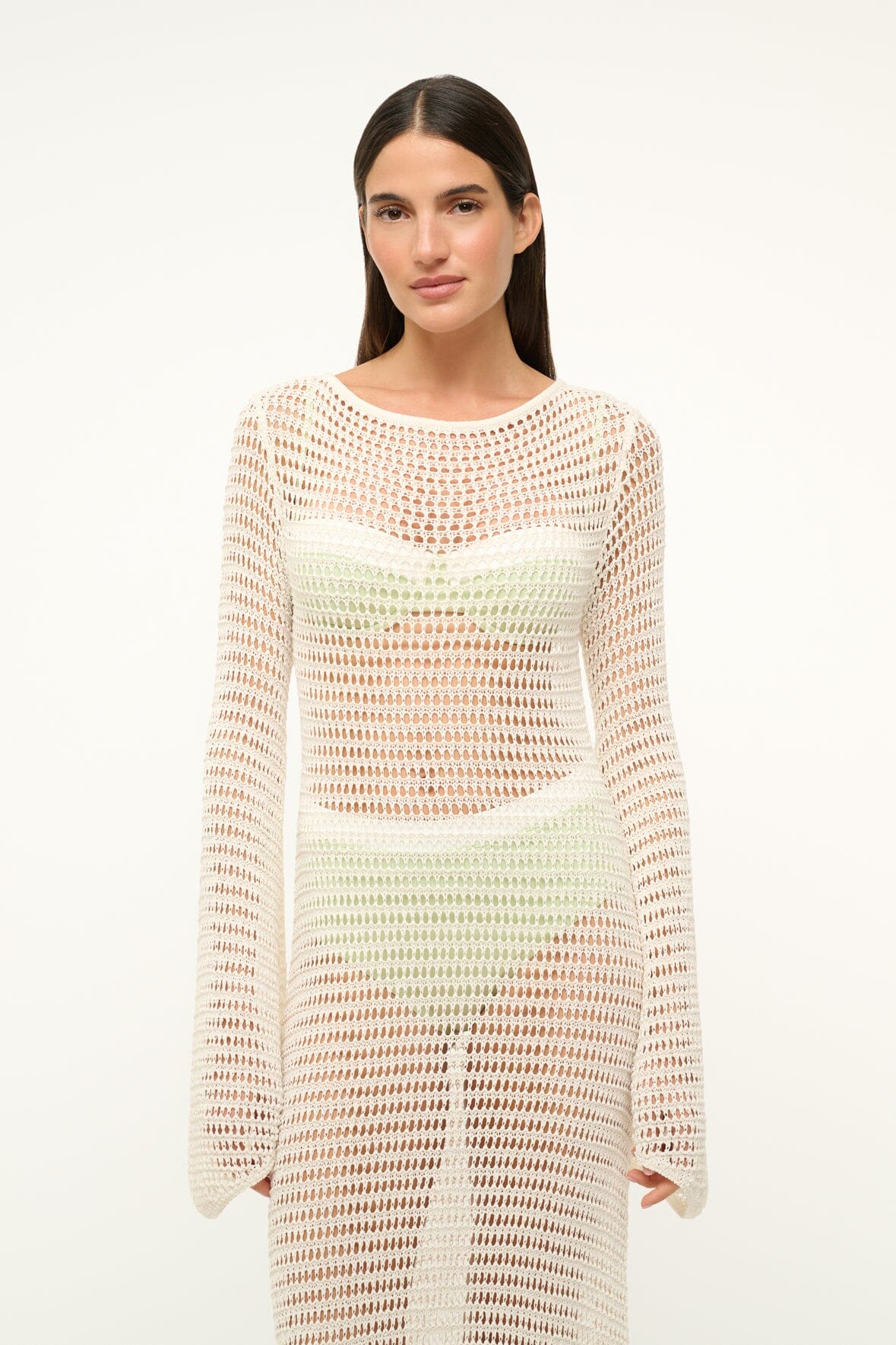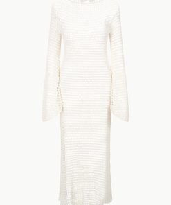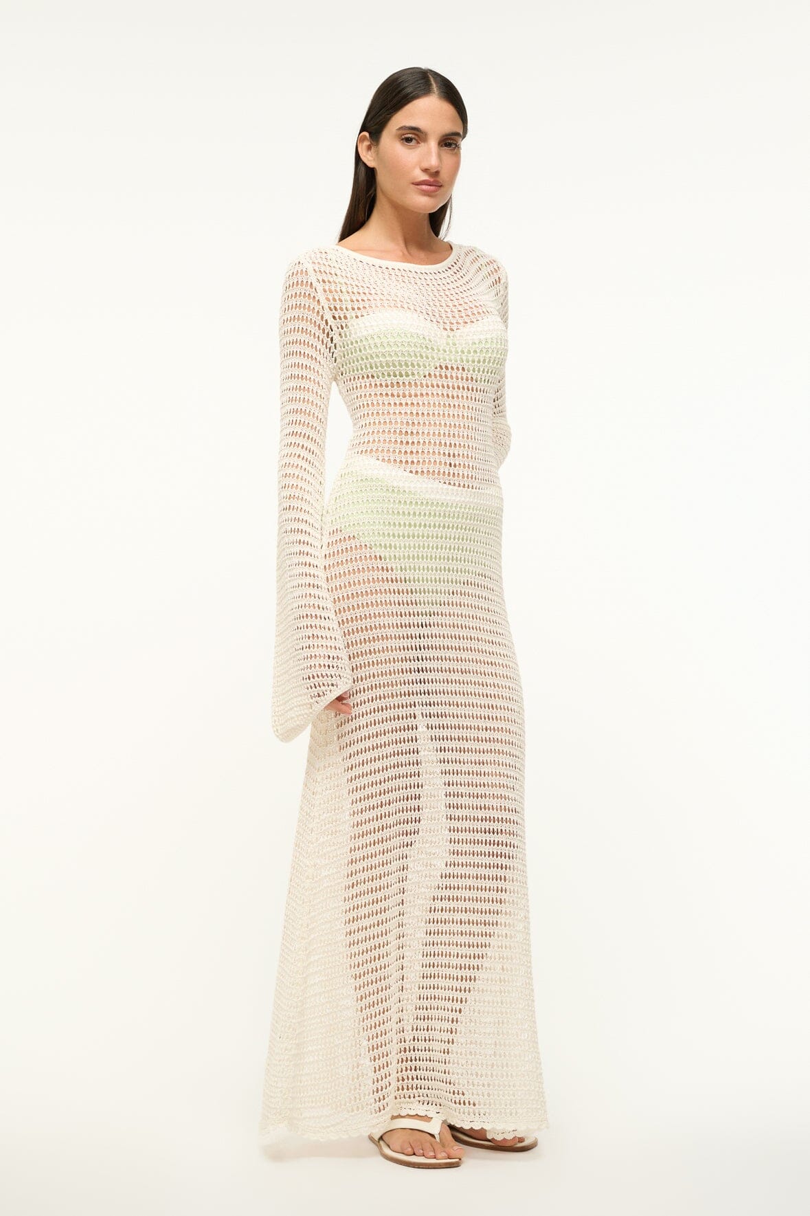 The Lorena Dress is a new maxi crochet dress, featuring a boat neckline and an open back. This style features a button closure at the neck, flared bell sleeves, and has an open weave.