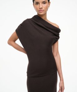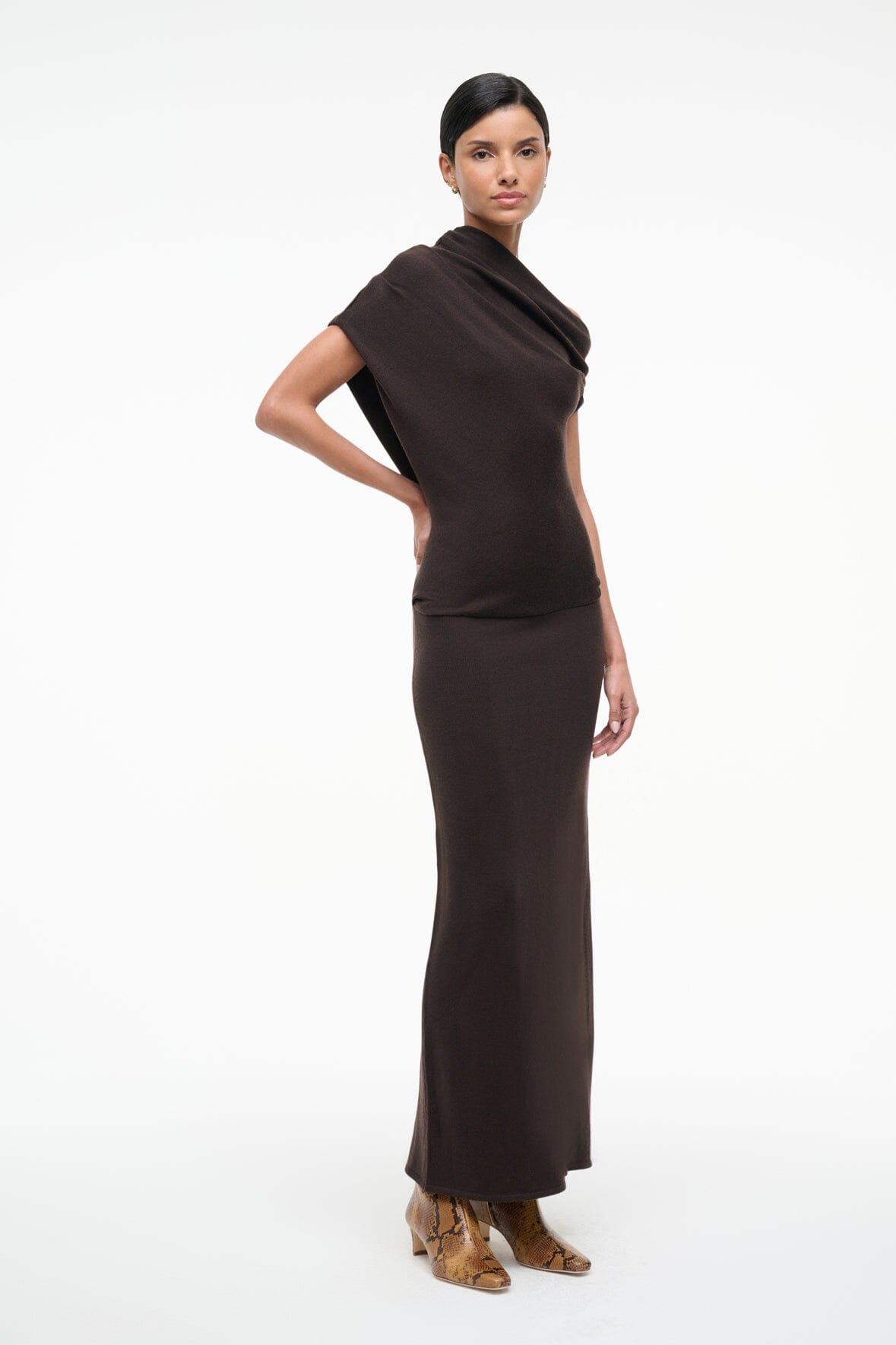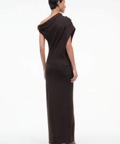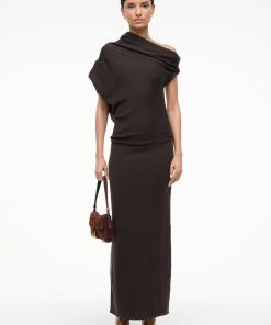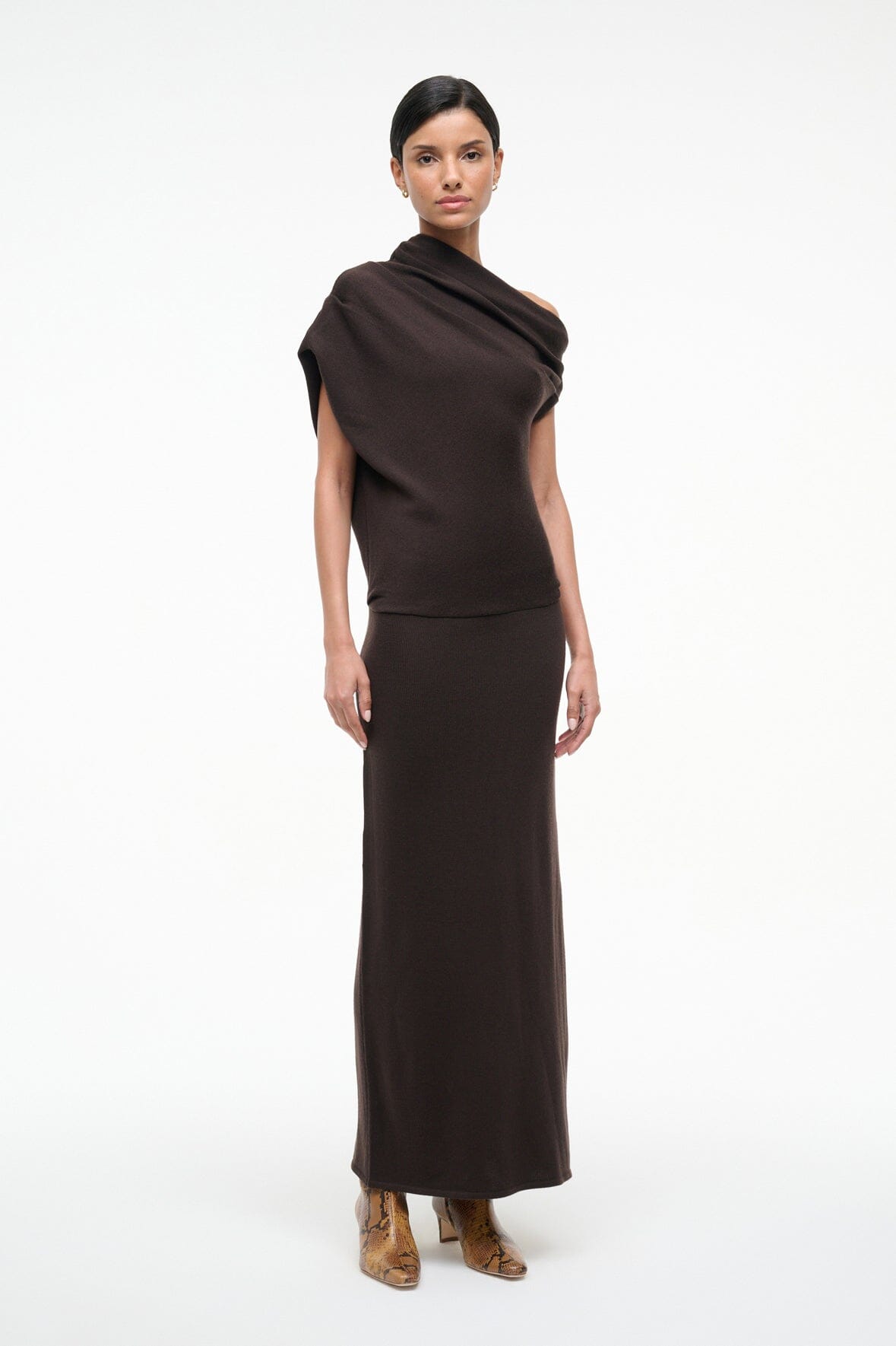 The Mable Dress is a new sweater dress silhouette. Knit in soft merino wool, the Mabel offers an asymmetrical off the shoulder sleeve and delicate draping throughout the body.