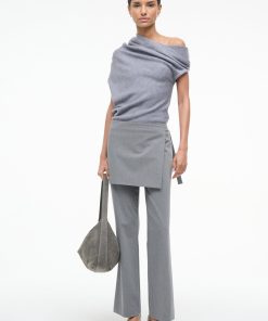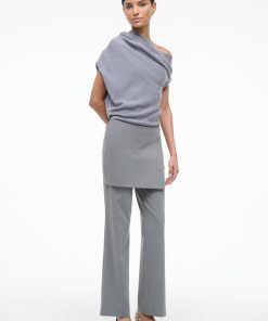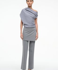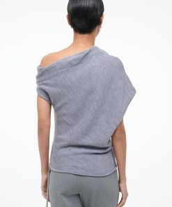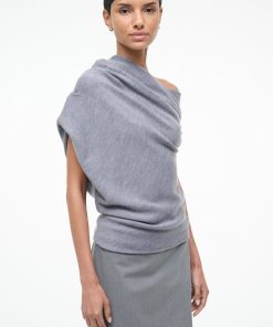The Mabel Sweater is an asymmetrical draped knit top, featuring a single off-the-shoulder look.