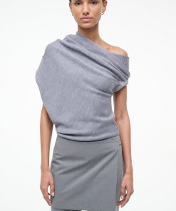 The Mabel Sweater is an asymmetrical draped knit top, featuring a single off-the-shoulder look.