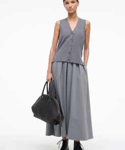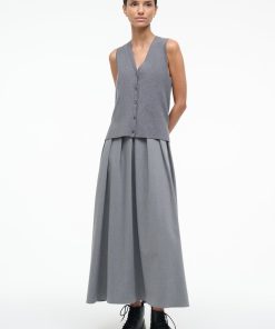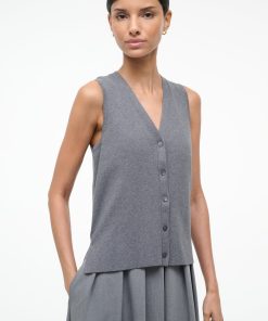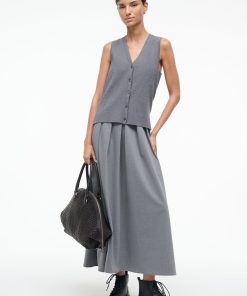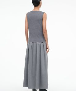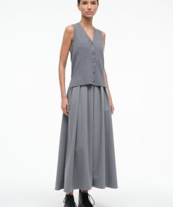 The perfect transitional dress, this pre-styled cotton and cashmere piece offers a pre-styled woven skirt and fully fashioned sleeveless knit vest.