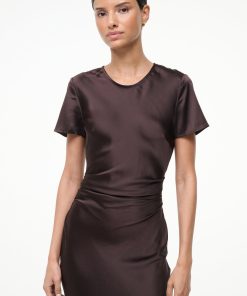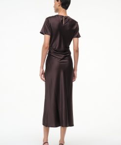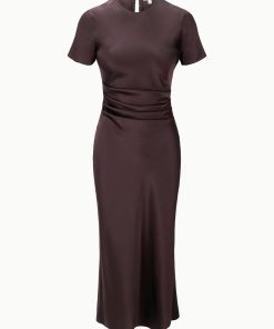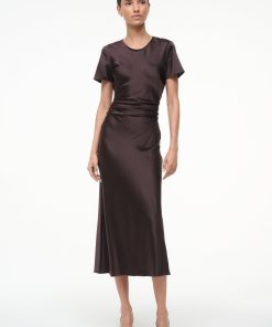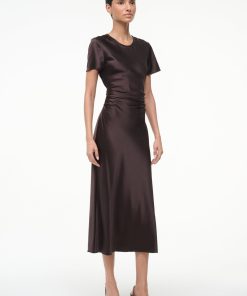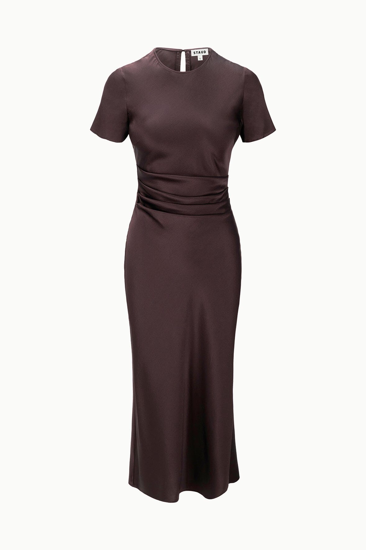 The Marcel Silk Dress is an easy cocktail dress crafted in stretch silk. This style is midi length and features ruching at the waist and has a hidden zipper.