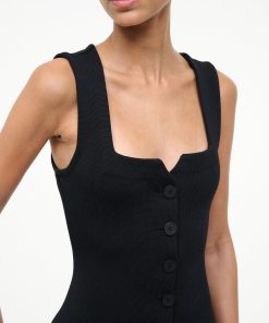 The Marisa Top is a chic compact knit top with a square neckline, a front button detail, and a cutaway detail at the top and bottom. This style can be paired with the Lena Skirt for a matching look.