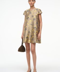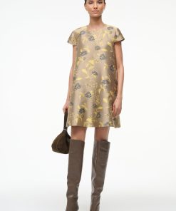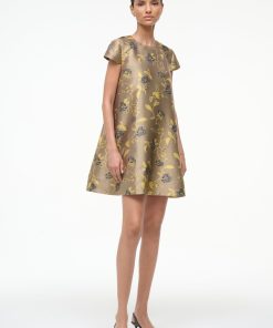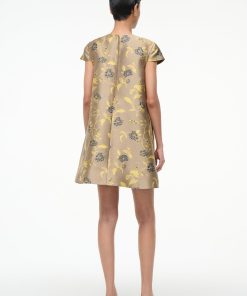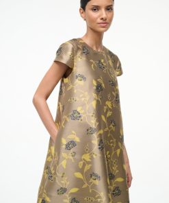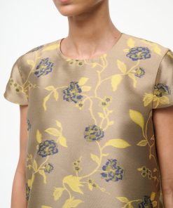 The Mia Dress is a new mini dress silhouette with a roomy fit throughout the body and cap sleeves in our floral brocade for Fall.