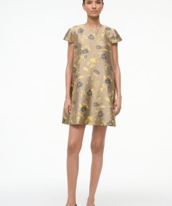 The Mia Dress is a new mini dress silhouette with a roomy fit throughout the body and cap sleeves in our floral brocade for Fall.