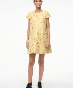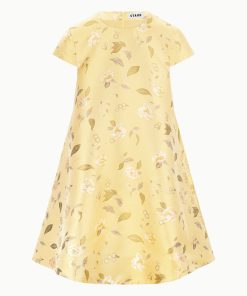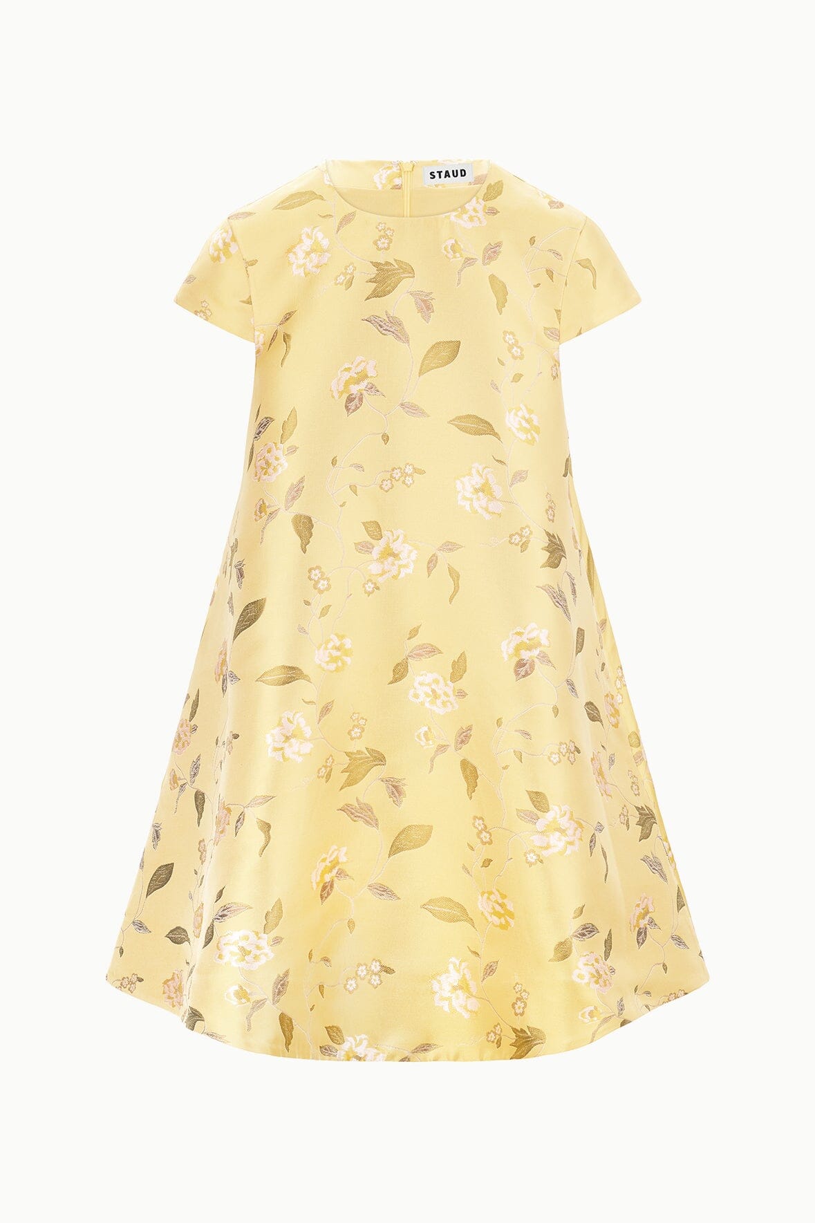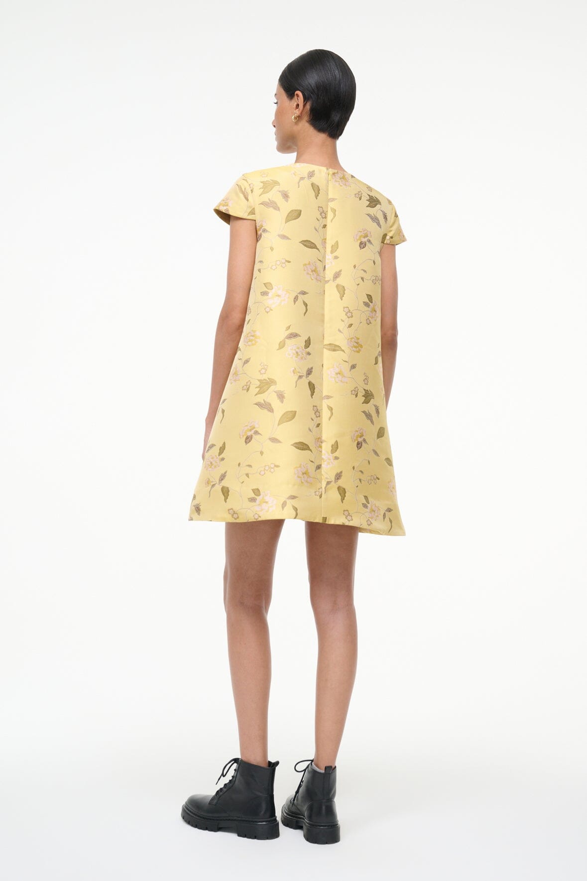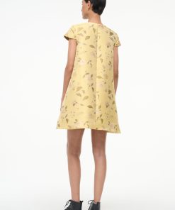 The Mia Dress is a new mini dress silhouette with a roomy fit throughout the body and cap sleeves in our floral brocade for Fall.