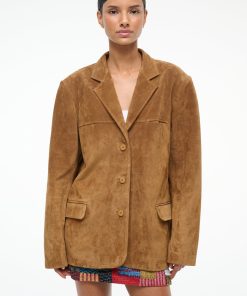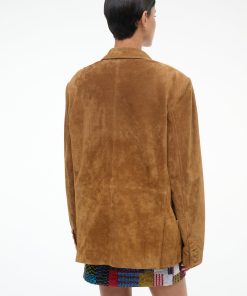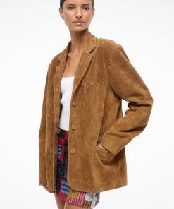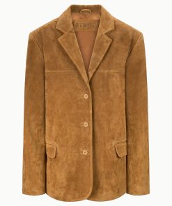 The Natalie Suede Jacket is a single breasted suede blazer with flap pockets and a small lapel collar.