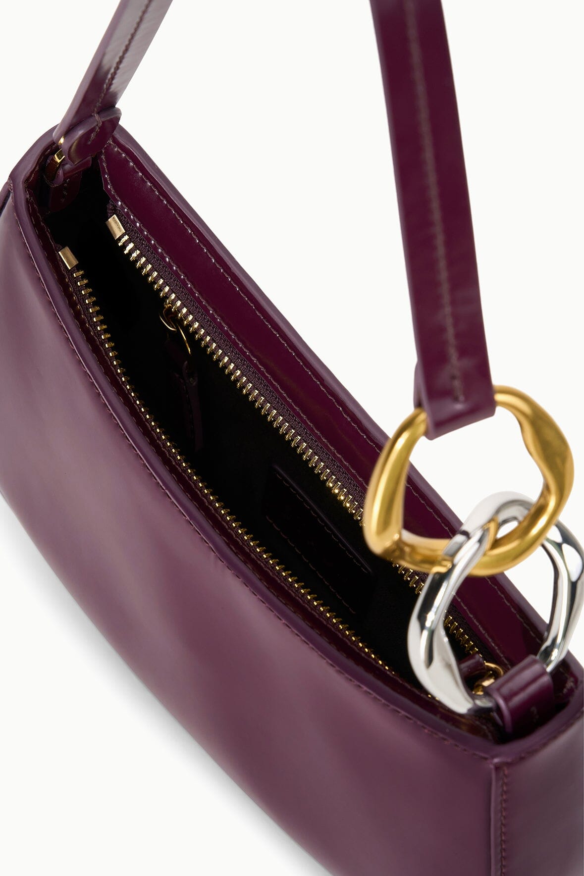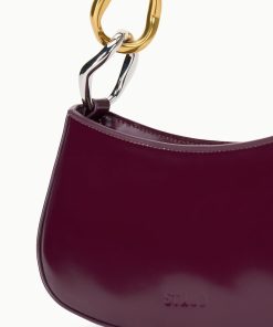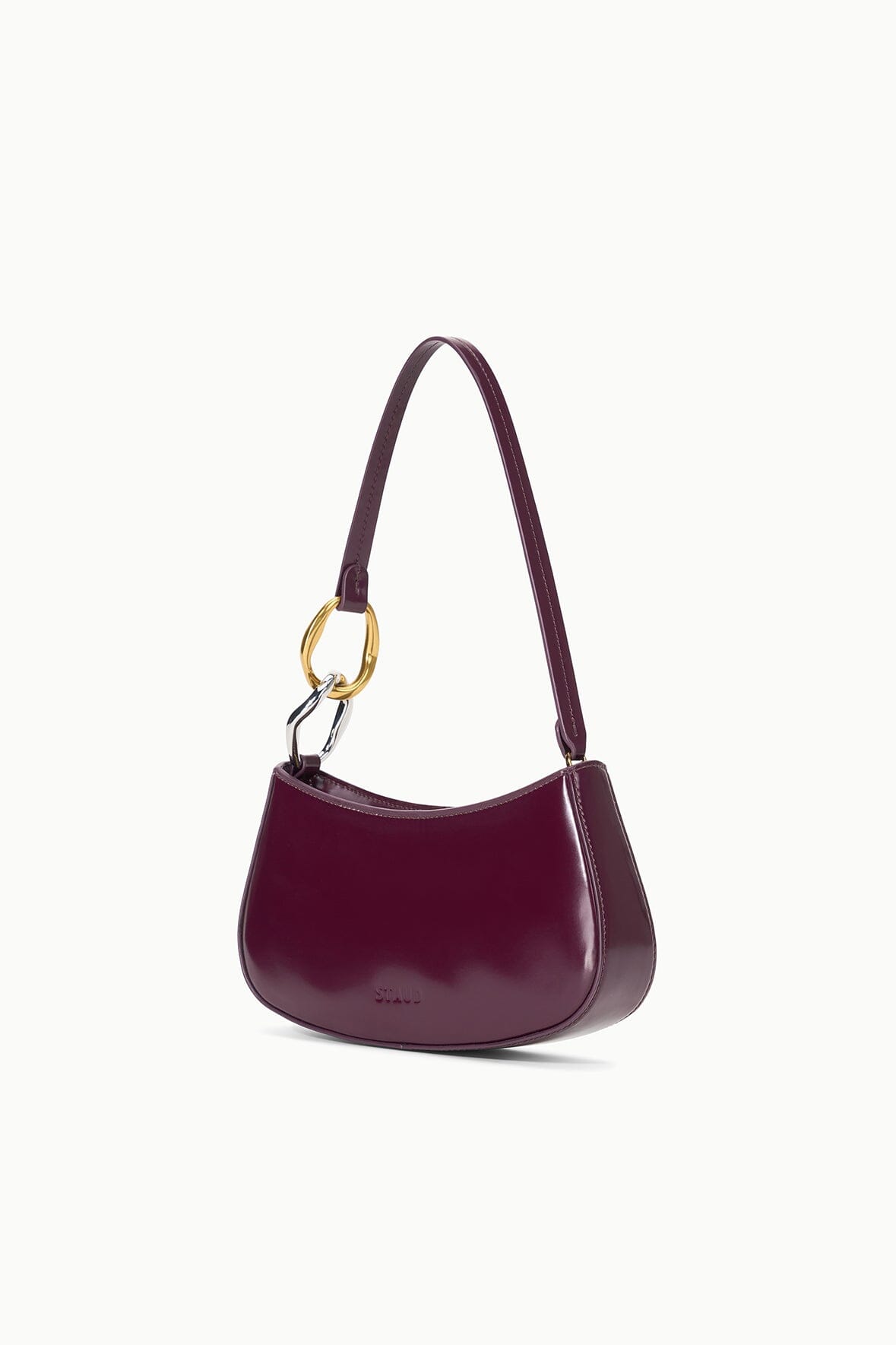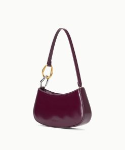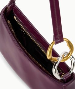 The Ollie Bag is a mini shoulder bag made out of polished leather. This style features a hardware design on the strap and a zip closure.