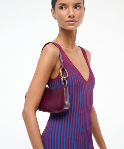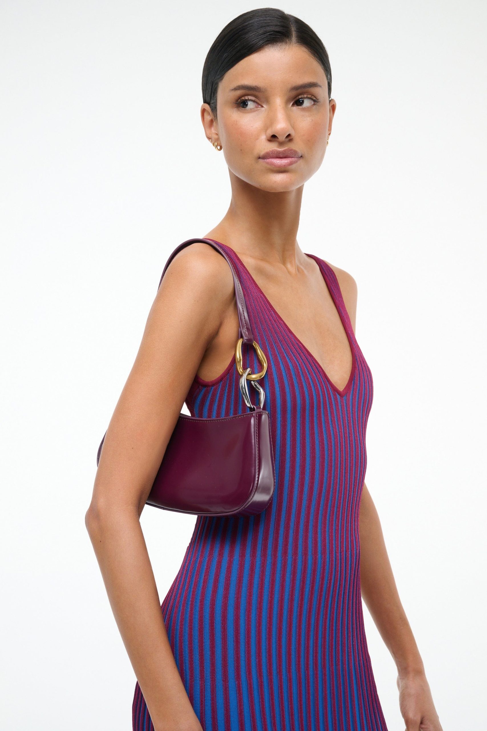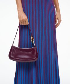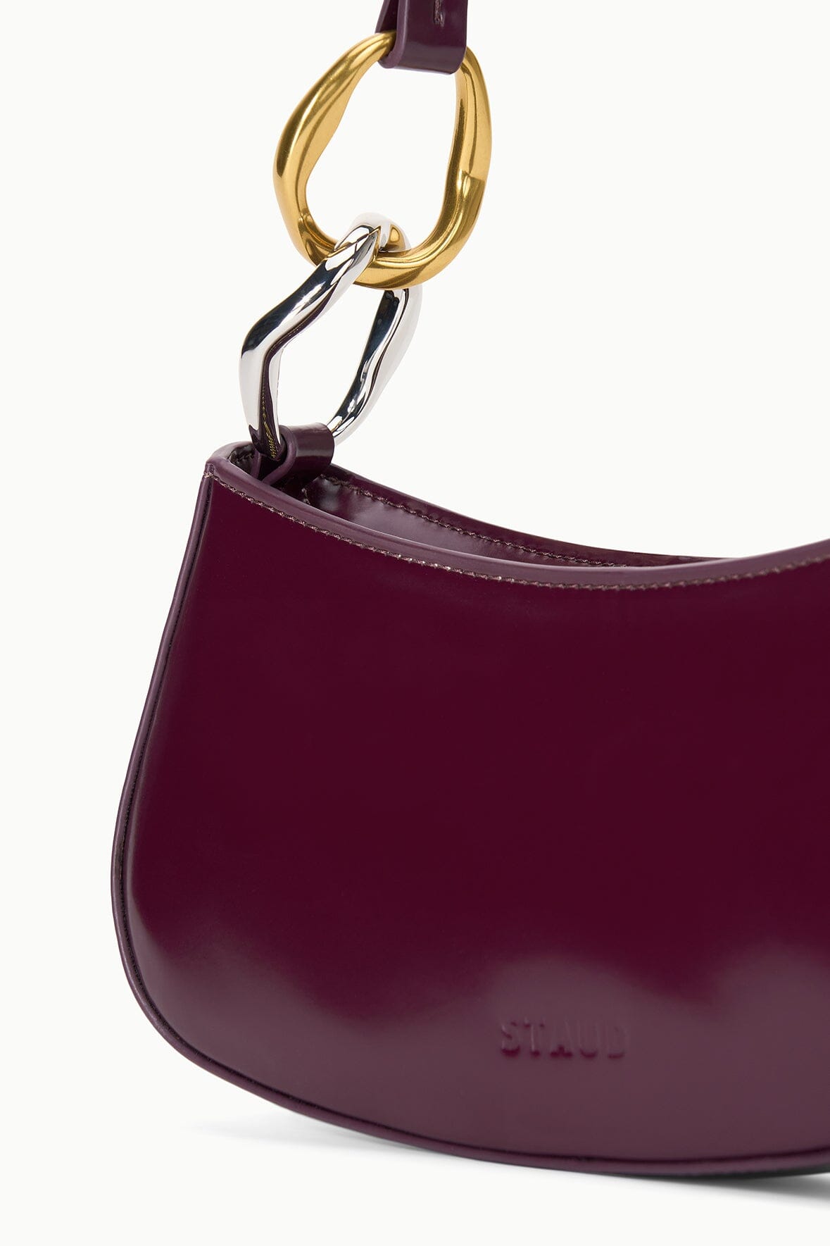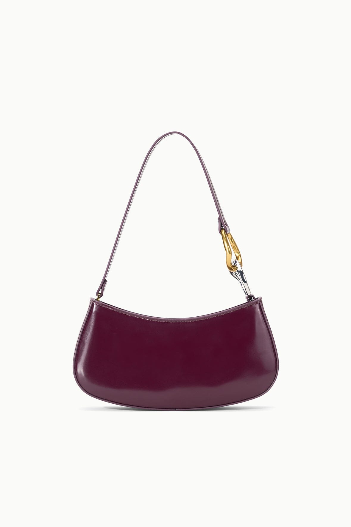 The Ollie Bag is a mini shoulder bag made out of polished leather. This style features a hardware design on the strap and a zip closure.