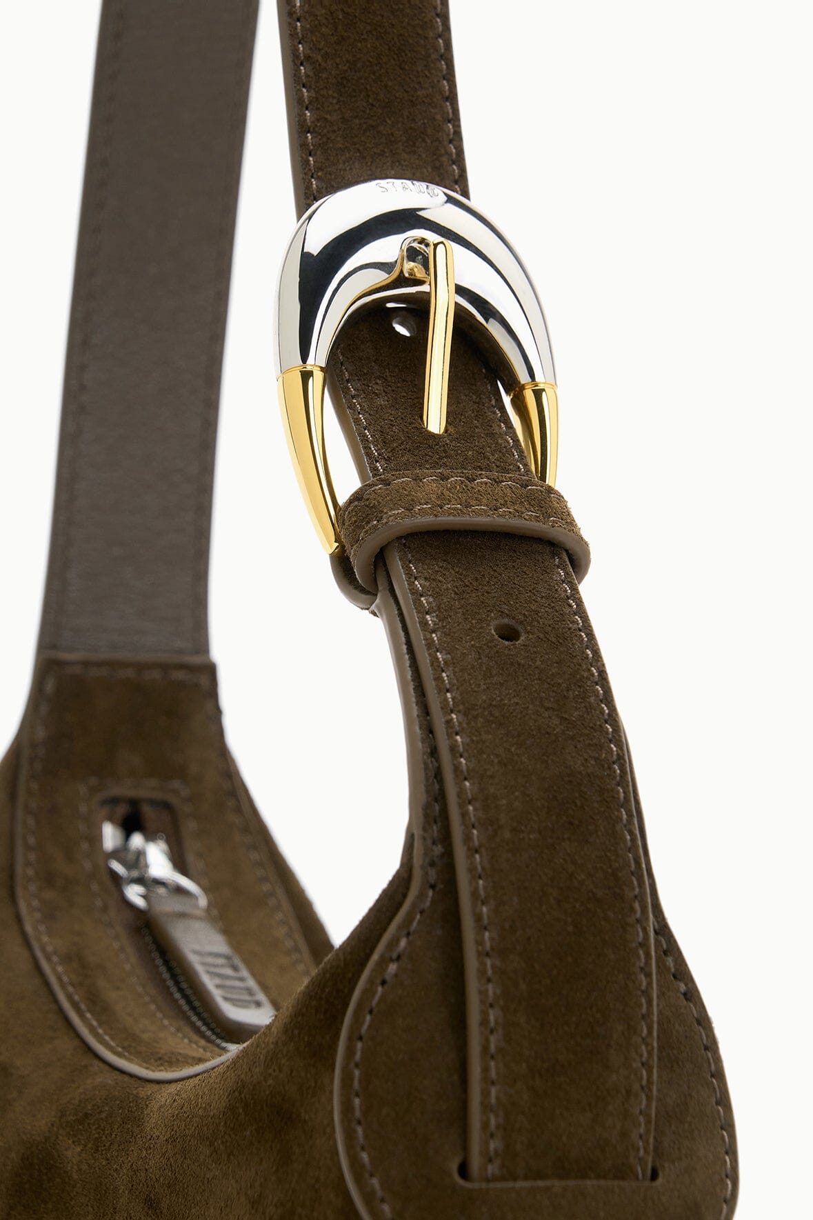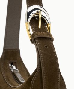 The Owen Bag is crafted in a Truffle suede and features our signature moon-buckle hardware and a top-zip.