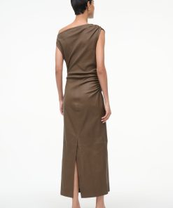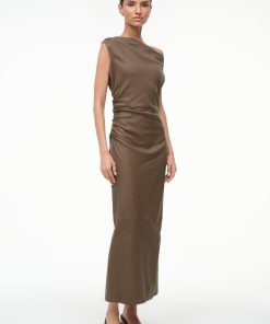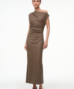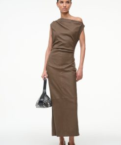 Our best selling Phare Dress has been updated for the season in beautiful stretch leather. This style features a draped off-the shoulder neckline, a fitted waist, and an ankle-grazing length.