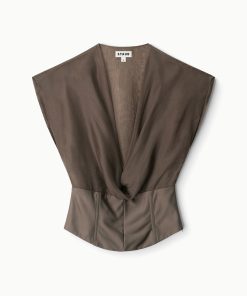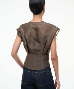 The Pinnacle Top is an organza top with a ponte corset-style waist with interior boning.
