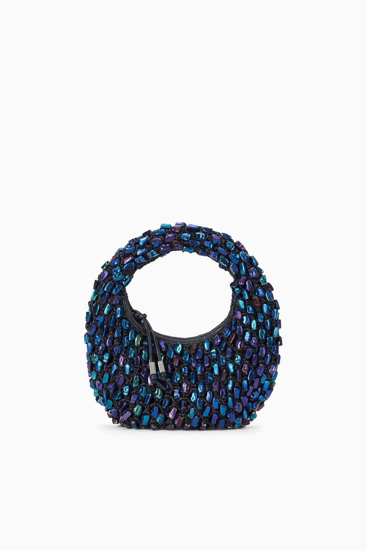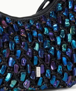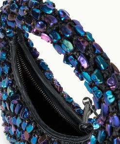 The Reef Bag is a hand held novelty bag crocheted with pearlescent beads. This style features a curved top handle and a zipper closure.
