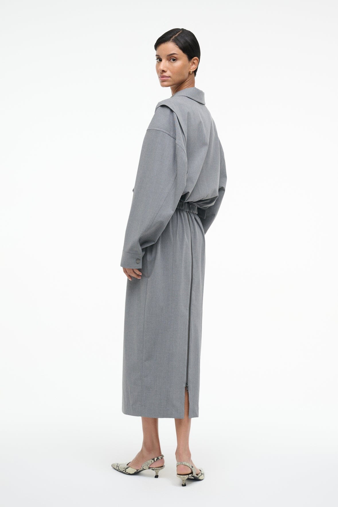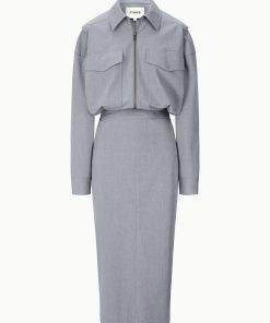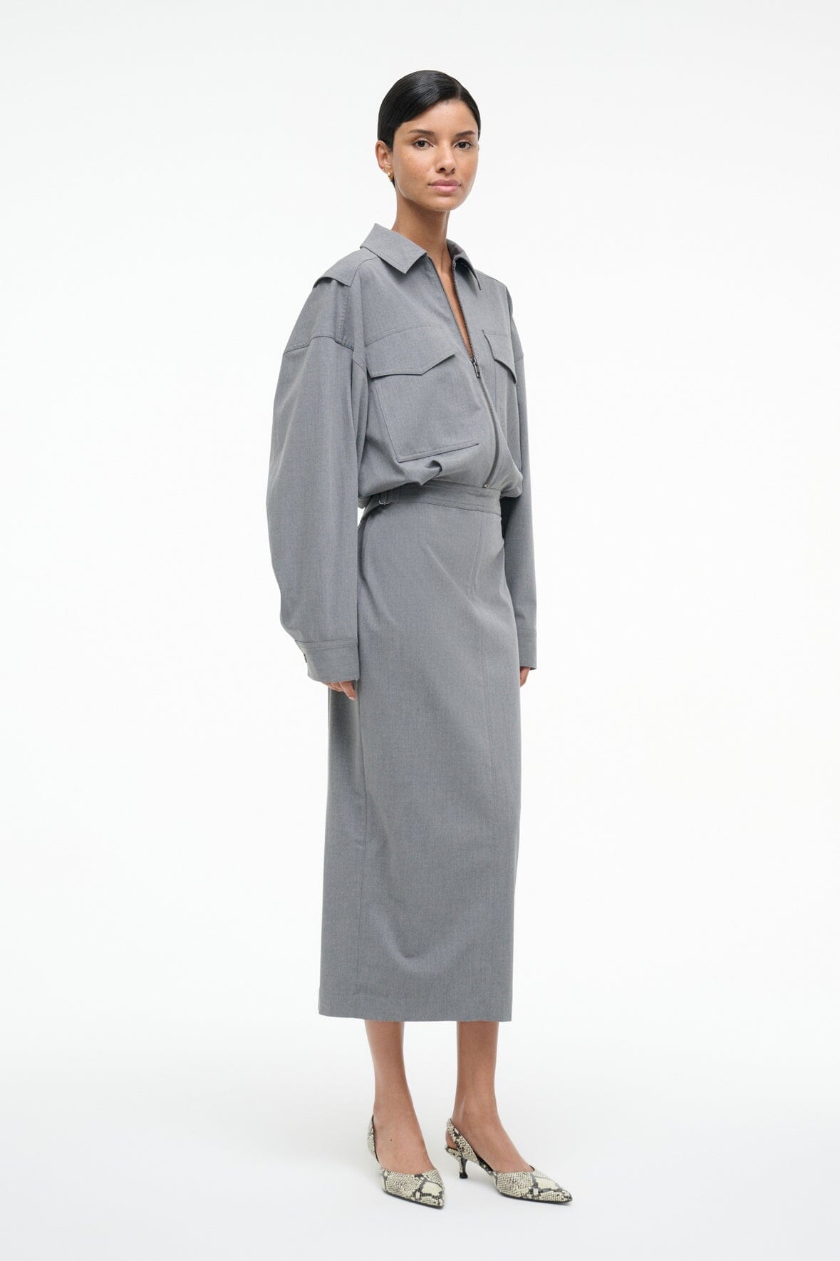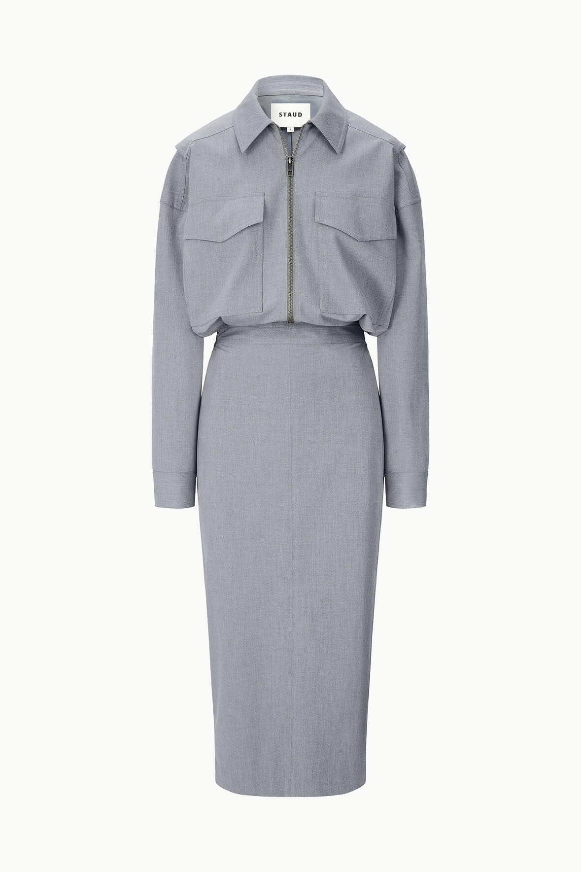 The Scout Dress is a structured zip-front dress with utility pockets and a sleek column skirt.