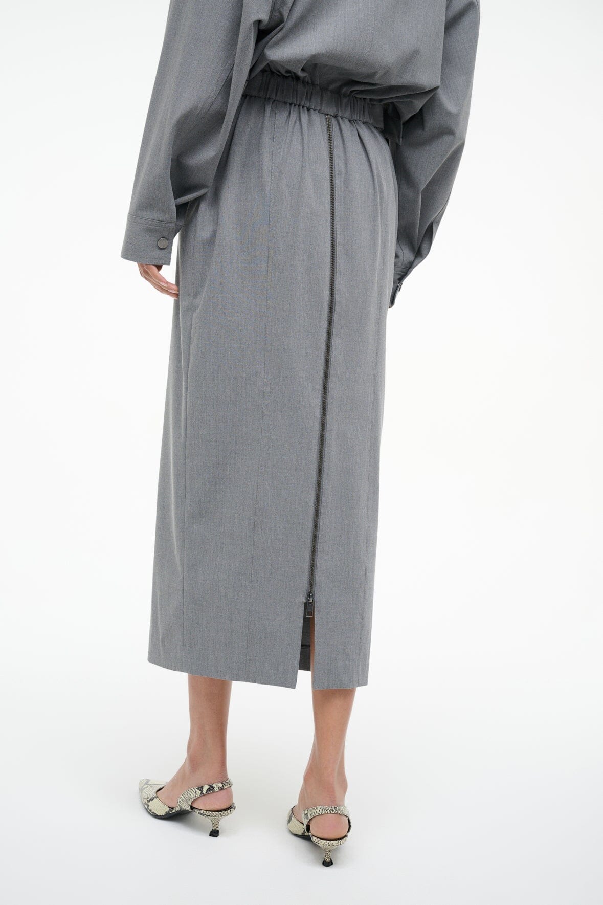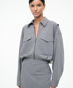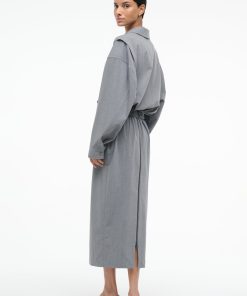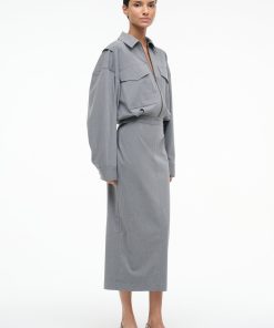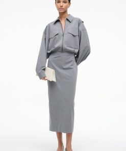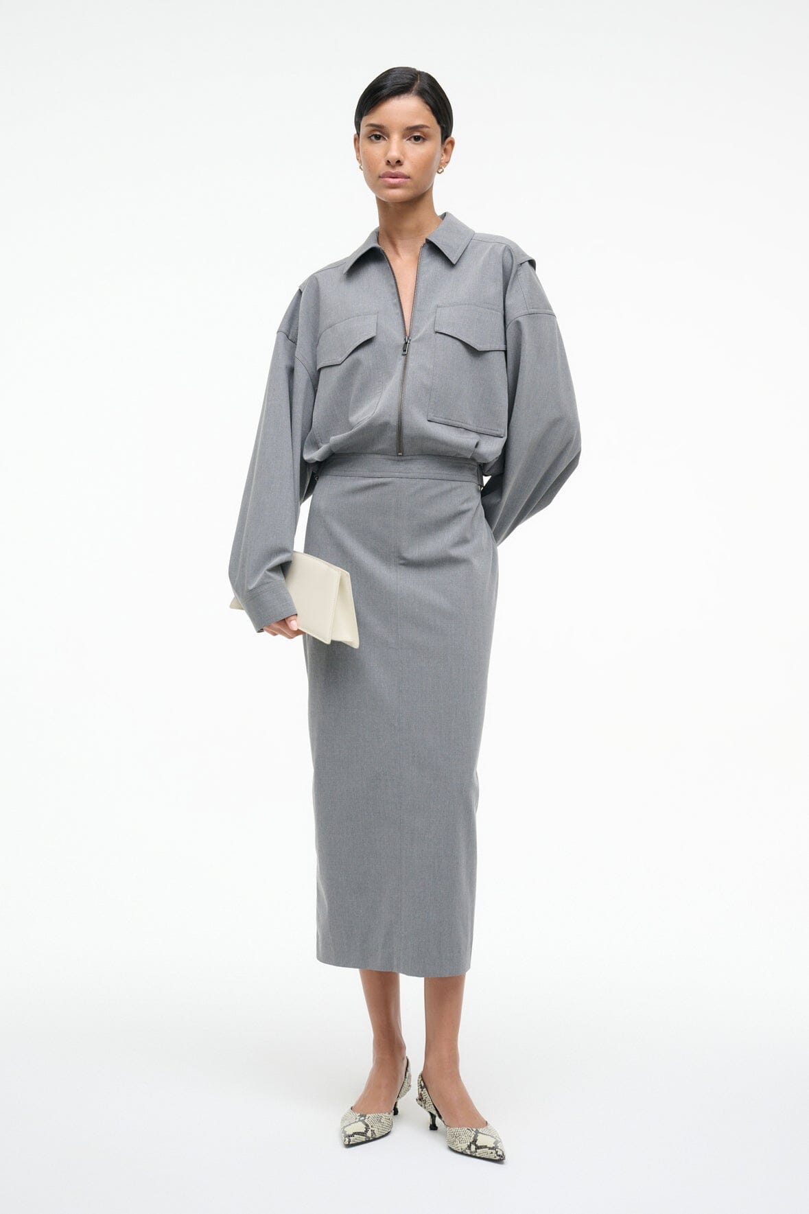The Scout Dress is a structured zip-front dress with utility pockets and a sleek column skirt.