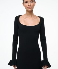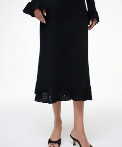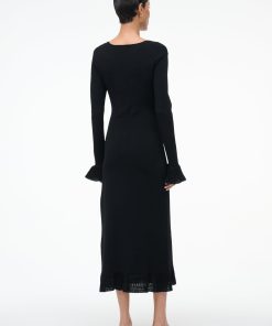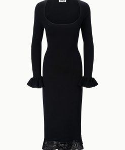 The Shelley Dress is a fitted knit midi dress with a flared crochet hem and flared crochet cuffs. This style has a square neckline and is fitted through the body.