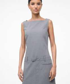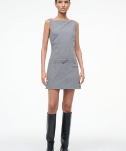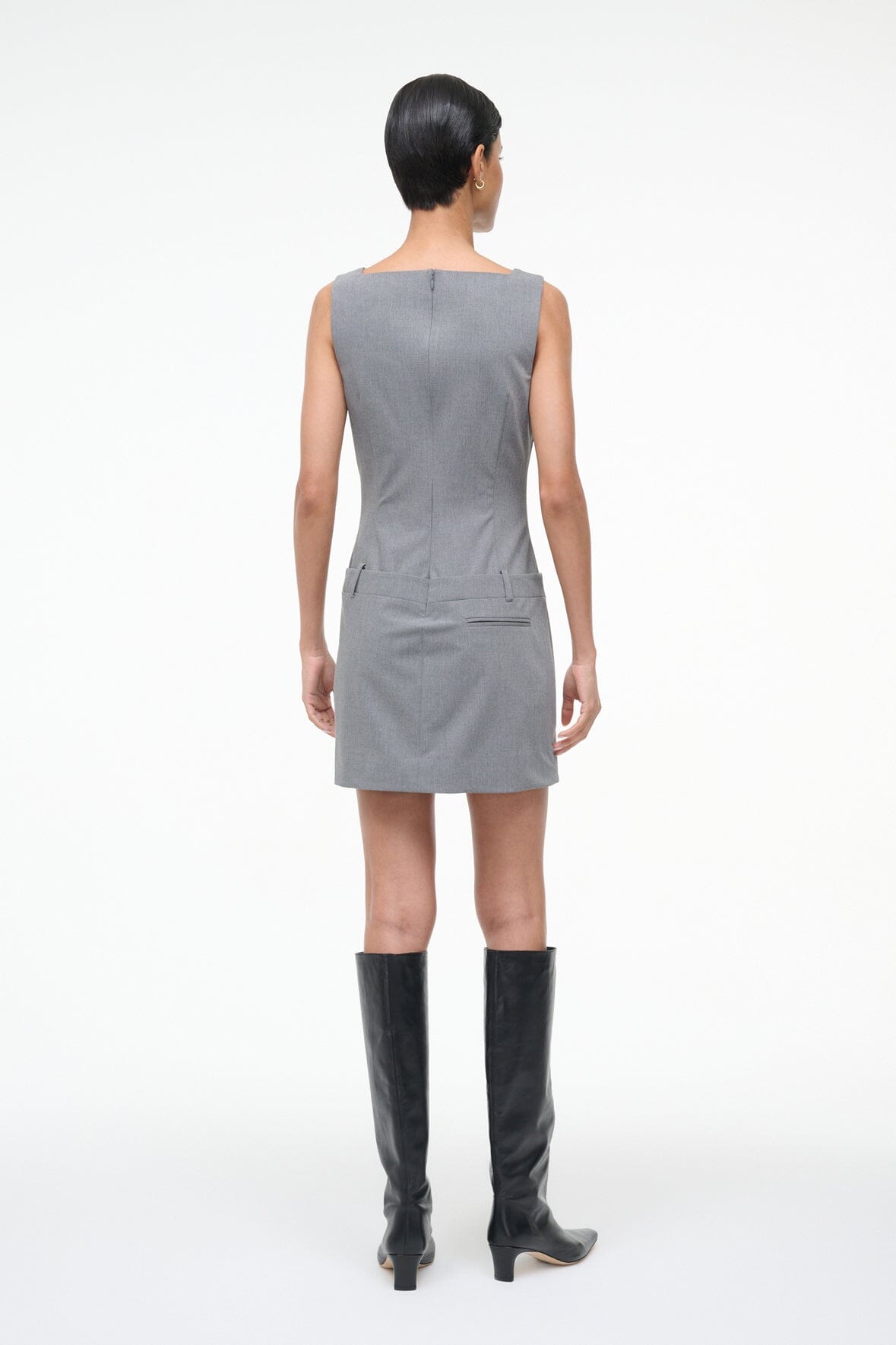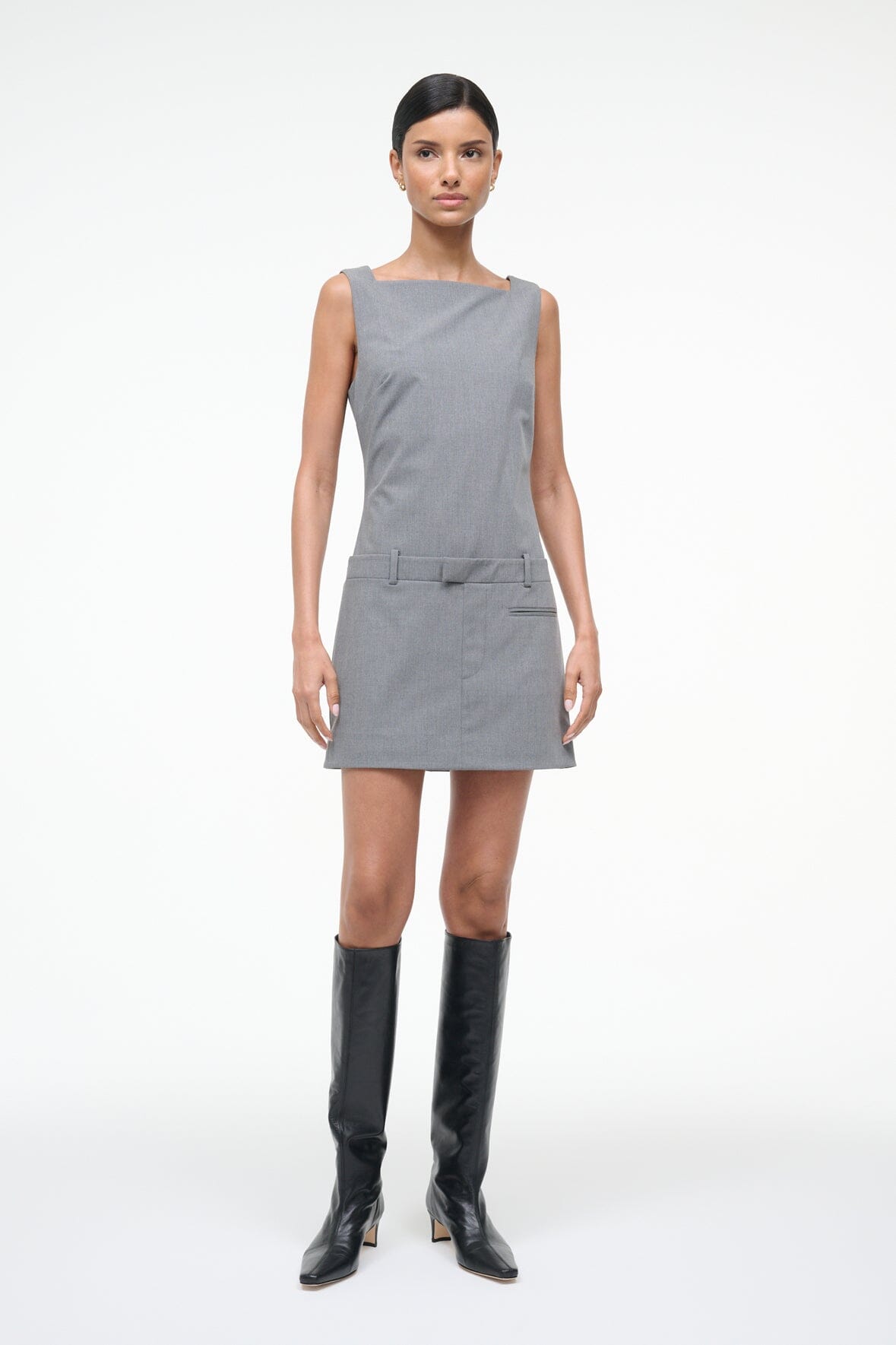 The Skyla is a mini shift dress with a boat neckline and drop waist detailing with belt loops.